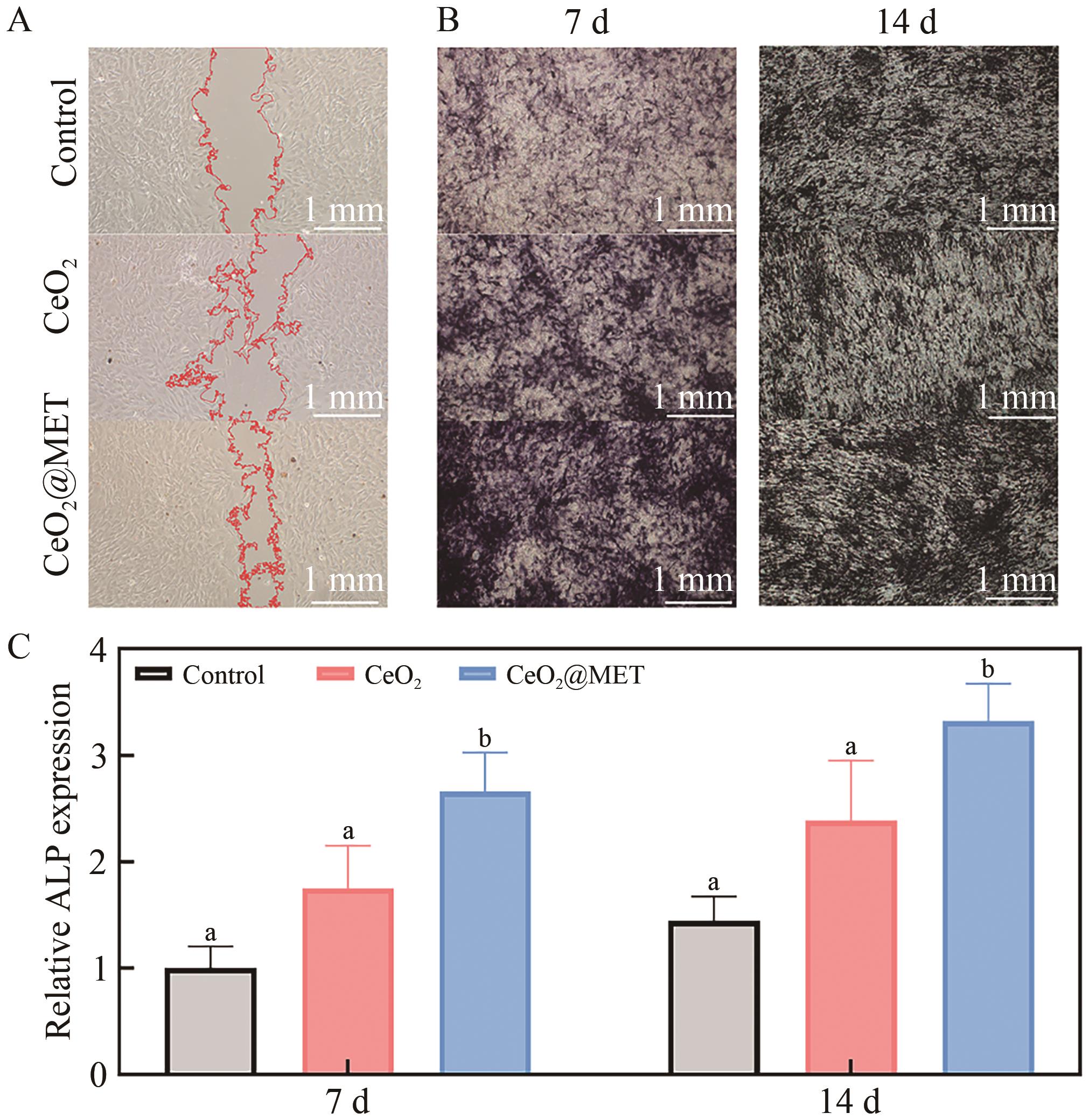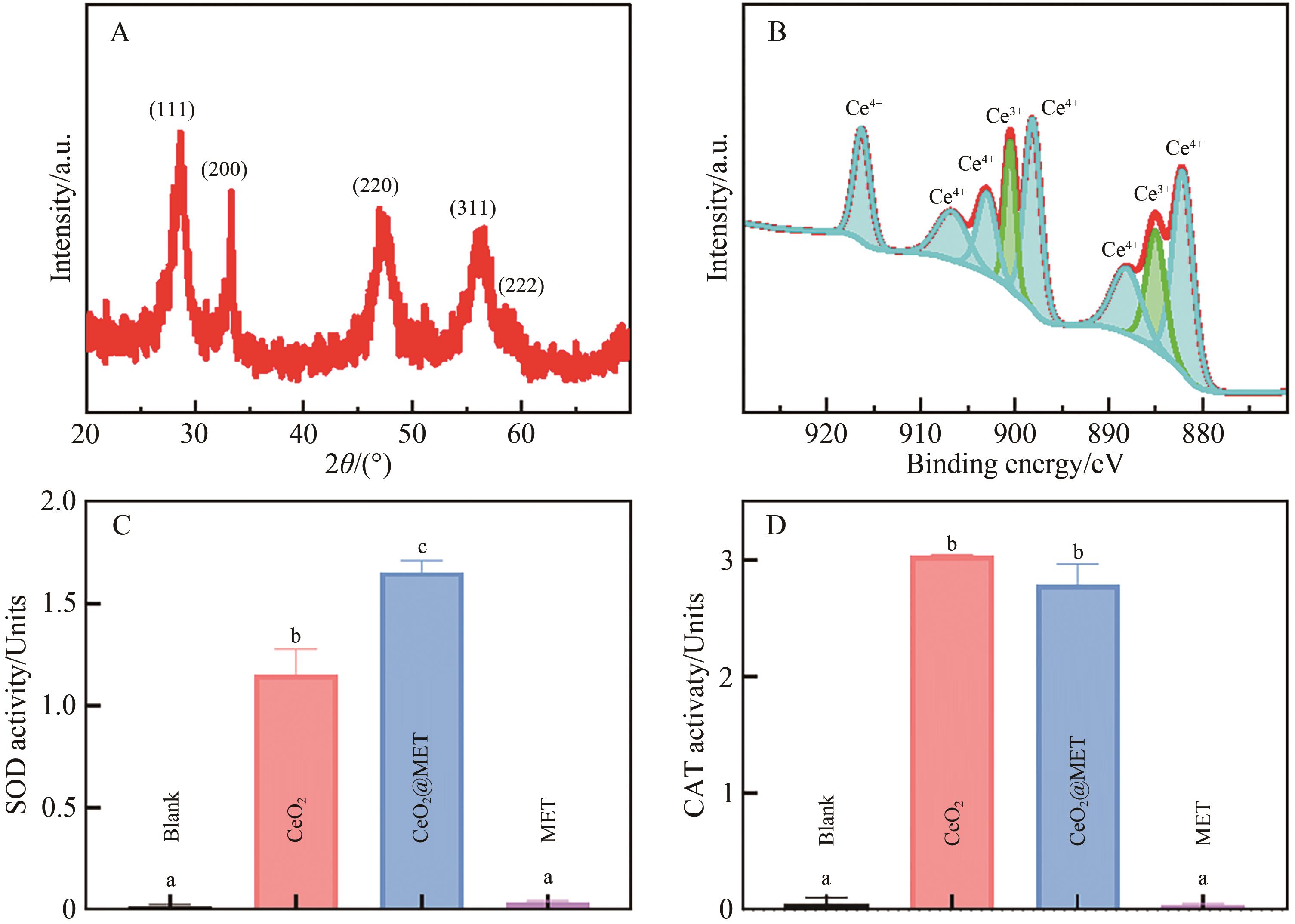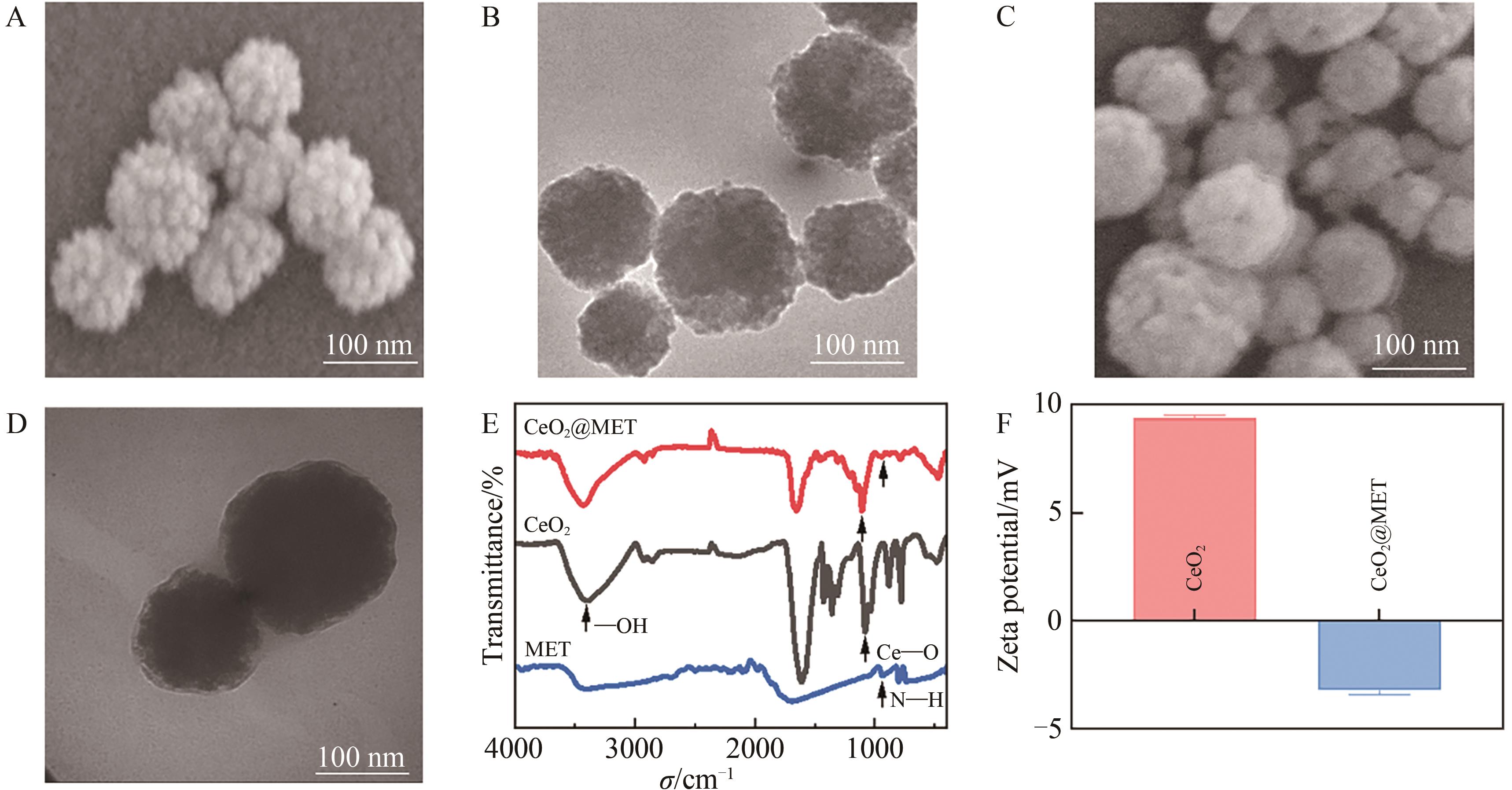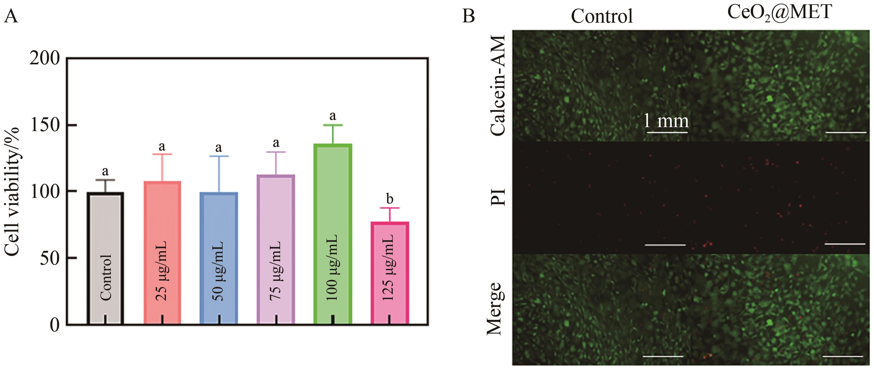 牙周炎是一种慢性炎症性疾病,其病理进程中产生的过量活性氧(Reactive oxygen species,ROS)破坏组织微环境稳态,阻碍骨组织修复与再生。 针对上述问题,通过水热法制备介孔二氧化铈(CeO2)纳米载体,利用物理吸附法负载二甲双胍(MET),构建了CeO2@MET复合纳米材料,并对其促成骨能力进行了研究。 实验结果显示,CeO?@MET具有均匀的介孔结构,MET负载量(质量分数)为(5.61±0.37)%,能够保留CeO2的立方萤石结构和氧空位(Ce3+占比为12.28%),并表现出优异的抗氧化酶活性和药物缓释特性。 当CeO2@MET质量浓度≤100 μg/mL时,能够显著促进MC3T3-E1前成骨细胞的增殖和迁移,同时增强其碱性磷酸酶活性表达,具有良好的生物相容性和促成骨分化能力。 本研究构建了兼具高效ROS清除与药物缓释控释功能的CeO2@MET纳米复合体系,实现了ROS清除与MET成骨诱导的双重功能协同,为克服牙周炎骨再生障碍提供了同时具备抗炎调控与高效促成骨活性的新型纳米材料策略,在牙周组织工程领域具有应用前景。