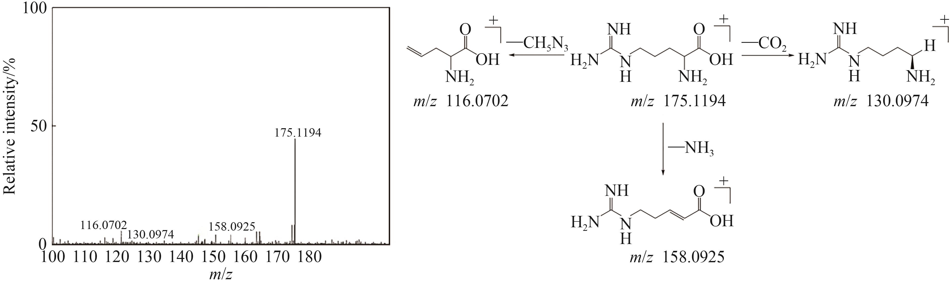 | 1 | 1.26 | Arginine[ | C6H14N4O2 | [M+H]+ | 175.119 4 | 175.118 9 | 158.092 5, 130.097 4, 116.070 2 | -2.9 | Amino acids and derivatives | e, f, g |
