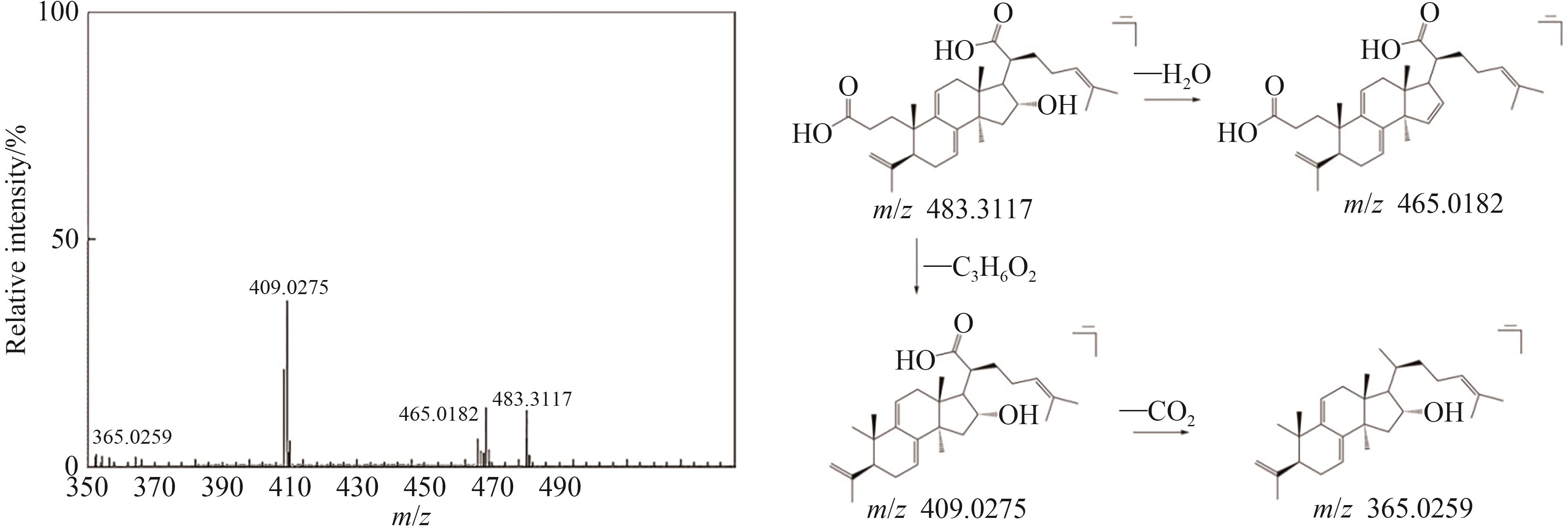 | 10 | 30.12 | Poricoic acid B[ | C30H44O5 | [M-H]- | 483.311 7 | 483.313 3 | 465.018 2, 409.027 5, 365.025 9 | 3.3 | Terpenoids | f |