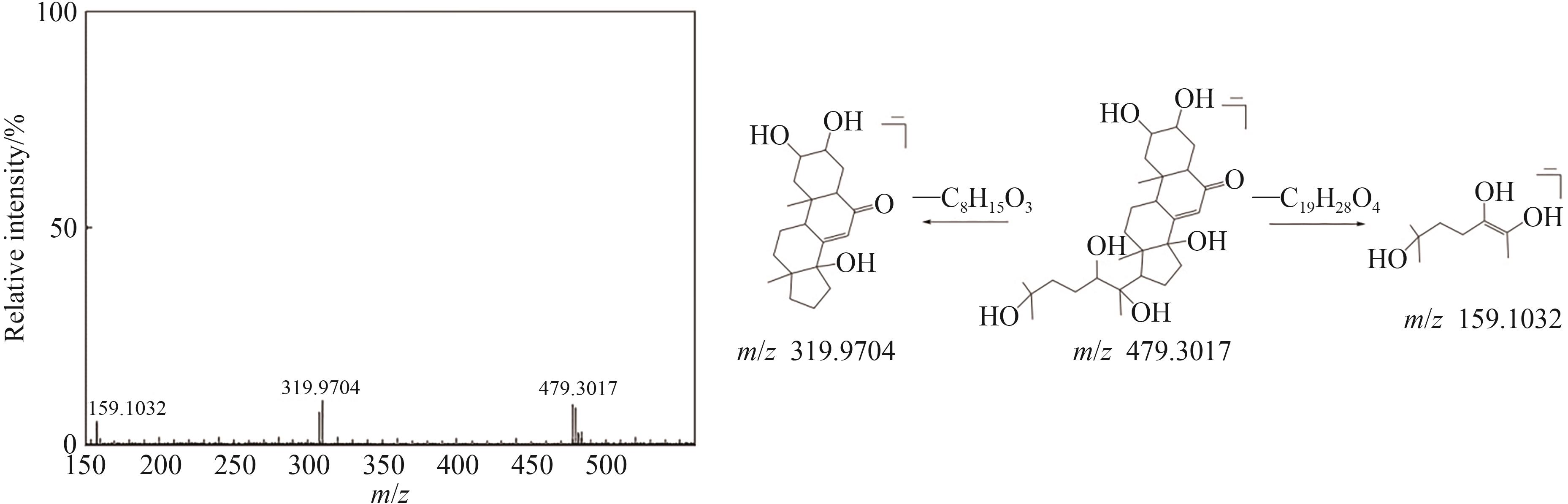 | 7 | 13.56 | Inokosterone A[ | C27H44O7 | [M-H]- | 479.300 2 | 479.301 3 | 461.296 7, 443.290 5 | 2.3 | Steroid hormone | g |