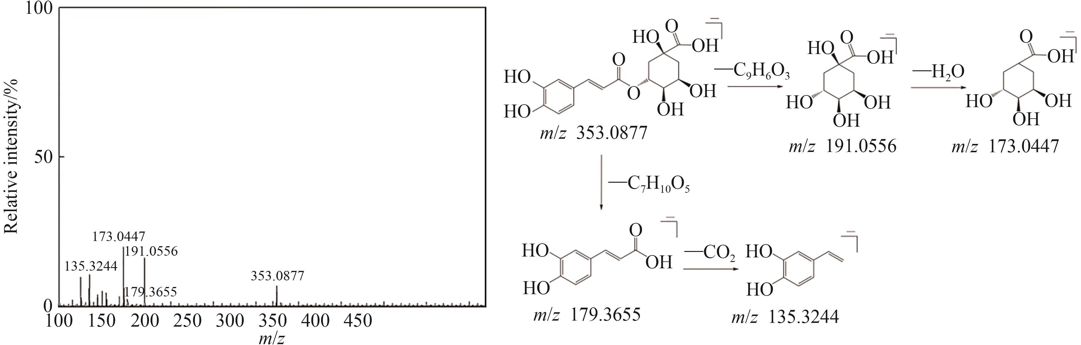| 36 | 77.21 | Chlorogenic acid[ | C16H18O9 | [M-H]- | 353.087 7 | 353.086 7 | 191.055 6, 179.365 5, 173.044 7, 135.324 4 | -2.8 | Organic acids | d |