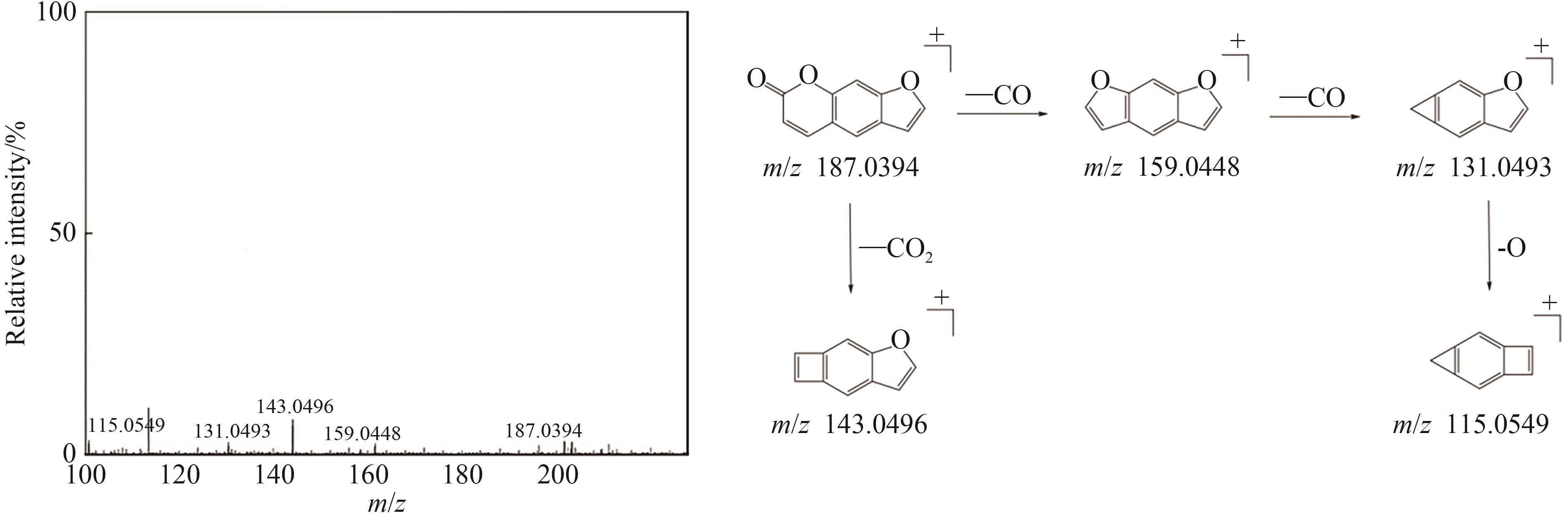 | 15 | 53.89 | Psoralen[ | C11H6O3 | [M+H]+ | 187.039 4 | 187.038 9 | 159.044 8, 143.049 6, 131.049 3, 115.054 9 | -2.7 | Coumarins | a |