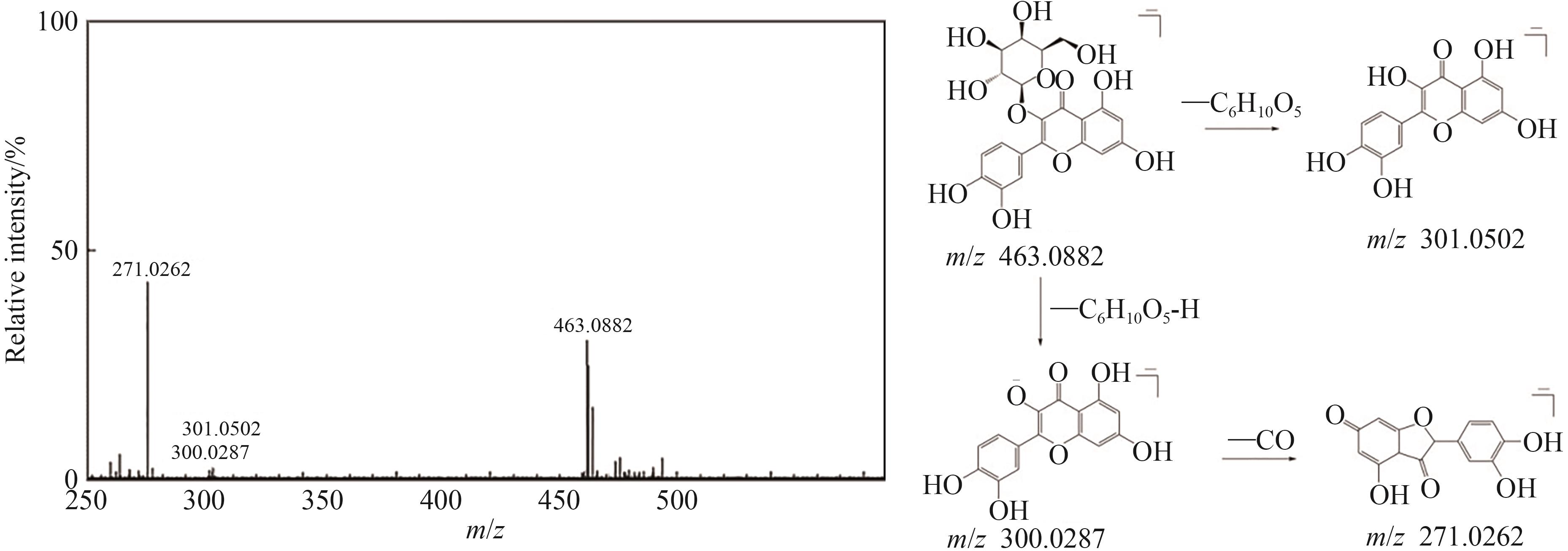 | 31 | 72.15 | Hyperoside[ | C21H20O12 | [M+H]- | 463.088 2 | 463.088 2 | 301.050 2, 300.028 7, 271.026 2 | 0 | Flavonoids | a |