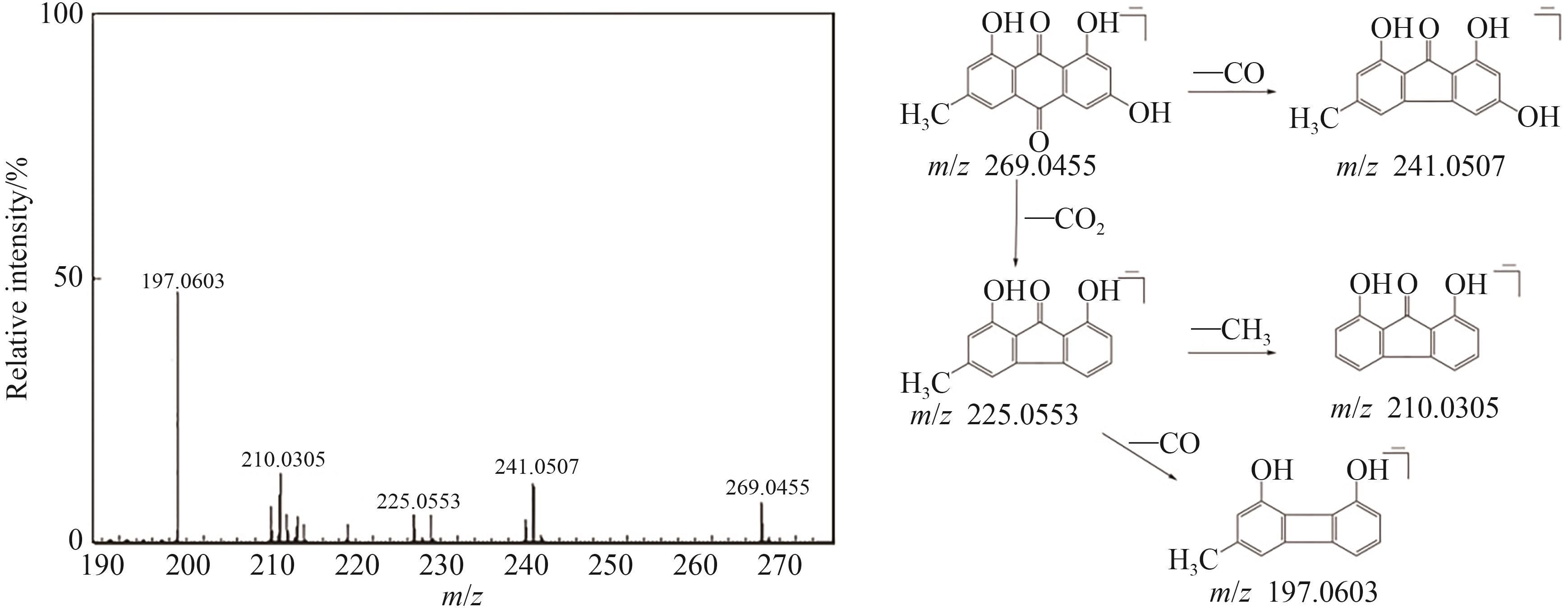 | 51 | 95.89 | Emodin[ | C15H10O5 | [M-H]- | 269.0455 | 269.0456 | 241.0507, 225.0553, 210.0305, 197.0603 | 0.4 | Anthraquinone | b |