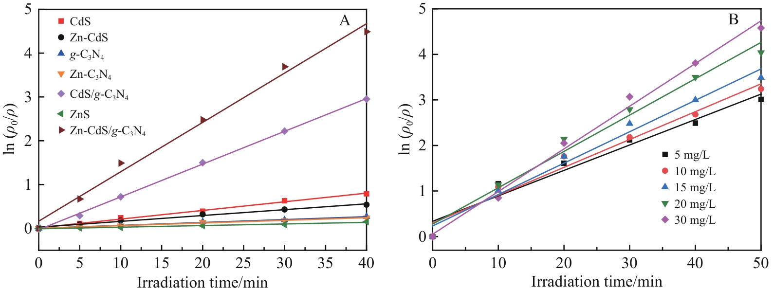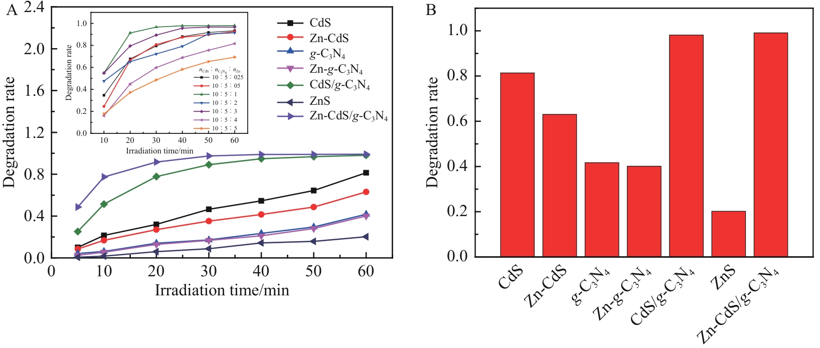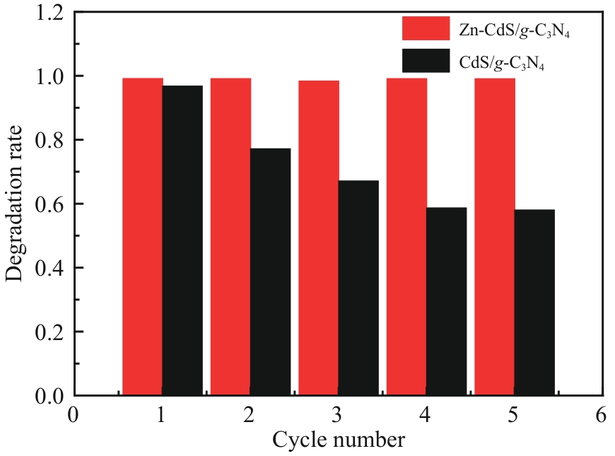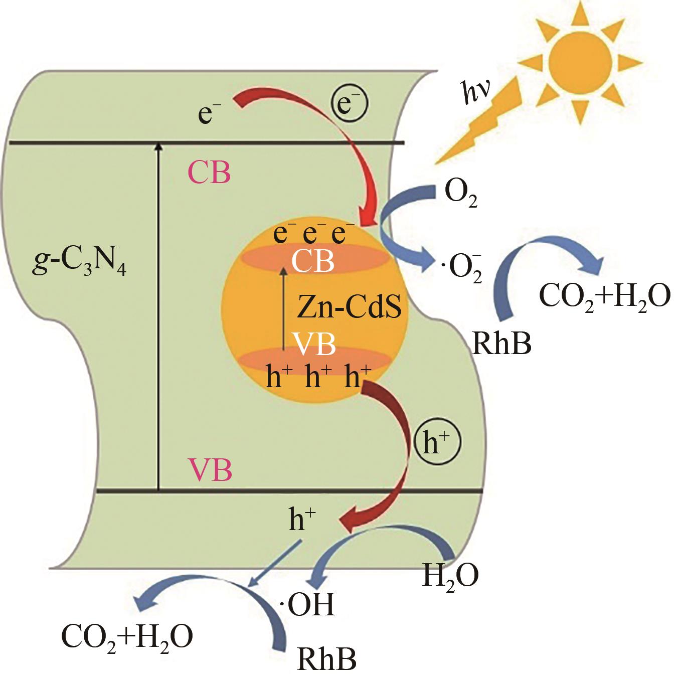 Under strong light irradiation, CdS quantum dots are prone to photocorrosion. The photocatalytic performance and photostability of CdS can be improved by metal doping and recombination. In this paper, Zn-doped CdS/g-C3N4 composite nanomaterials (Zn-CdS/g-C3N4) were synthesized by a hydrothermal method. The morphology, structure and composition of Zn-CdS/g-C3N4 were characterized by scanning electron microscope (SEM), transmission electron microscope (TEM), X-ray diffraction (XRD), X-ray photoelectron spectrometer (XPS) and Fourier transform infrared spectroscopy (FT-IR). The results show that Zn-CdS nanoparticles are attached on g-C3N4 to form Zn-CdS/g-C3N4 composite nanomaterials with the smaller band gap and lower recombination rate of electron-hole. The photocatalytic performance of Zn-CdS/g-C3N4 for rhodamine B (RhB) was studied. Under the optimum conditions, the photocatalytic degradation efficiency of as-prepared Zn-CdS/g-C3N4 is up to 99% after 40 min of light irradiation with 500 W Xe lamp. In addition, the synthesized Zn-CdS/g-C3N4 composites have high photostability and good reproducibility. This is attributed to the synergistic effect between Zn and Cd and the recombination with g-C3N4, which promotes the separation and transfer of photogenerated carriers.