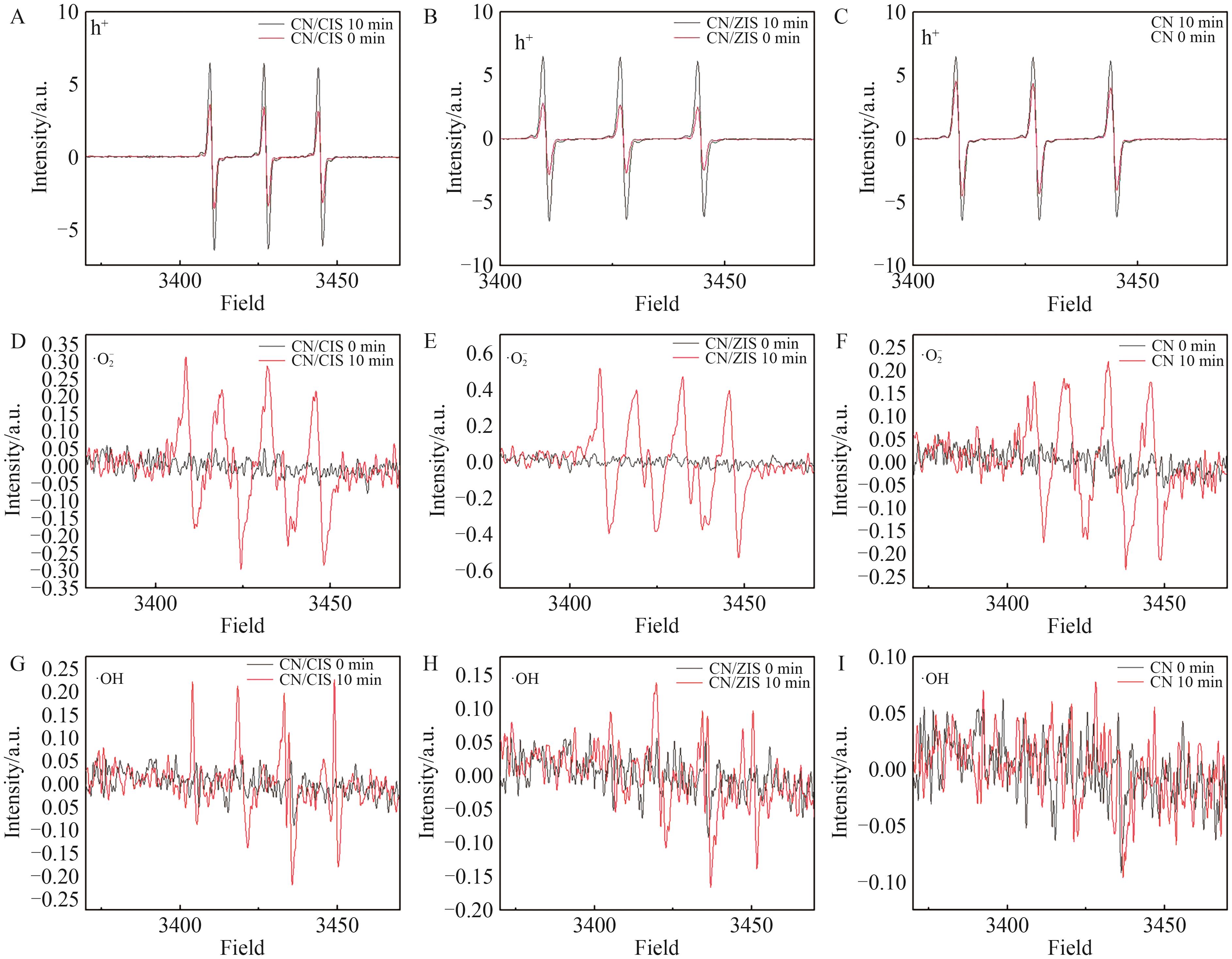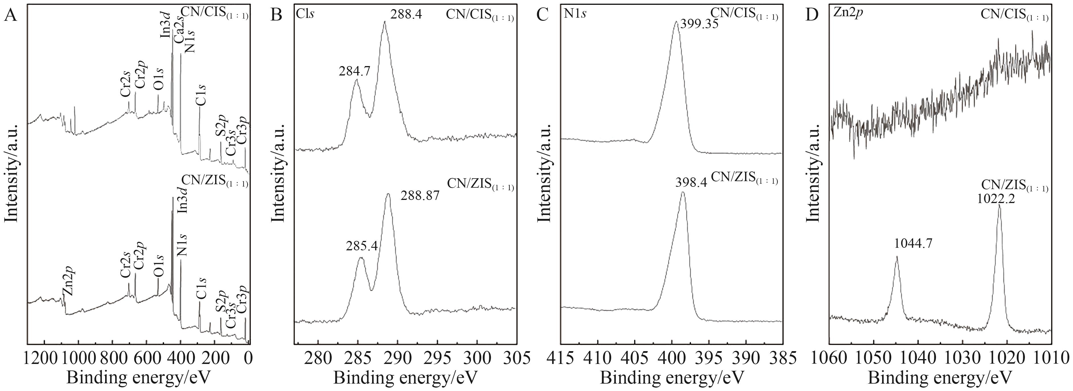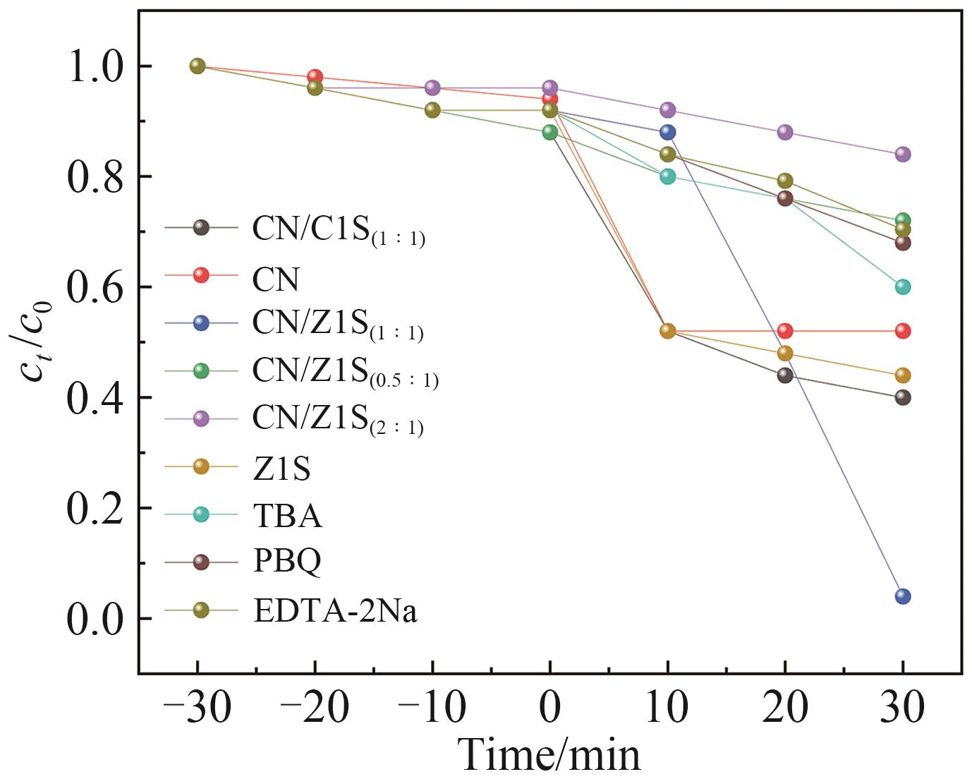 Hexavalent chromium compounds are widely used in the chemical industry and are difficult to degrade naturally. Using composite nanomaterials as photocatalysts to treat hexavalent chromium Cr(Ⅵ) shows high photocatalytic activity. g-C3N4/ZnIn2S4 and g-C3N4/CaIn2S4 nano heterojunction materials were prepared by hydrothermal method, and characterized by X-ray diffraction (XRD), scanning electron microscopy (SEM), physical adsorption analyzer (BET), UV-visible near-infrared spectroscopy (UV-Vis-NIR), X-ray photoelectron spectroscopy (XPS) and electron spin resonance (EPR). The reduction capacity of g-C3N4/ZnIn2S4 and g-C3N4/CaIn2S4 materials on Cr(Ⅵ) was tested in both non illuminated and visible light environments, and 1,4-benzoquinone (PBQ, 1 mmol), disodium ethylenediaminetetraacetic acid (EDTA-2 Na, 1 mmol) and tert-butanol (TBA, 0.5 mL) were used as scavengers for superoxide radicals(·O2-), holes(h+) and hydroxyl radicals (·OH). The active species of the photocatalytic reaction were determined based on the changes in the degradation concentration of Cr(Ⅵ) after capturing different radicals. The experimental results show that the g-C3N4/ZnIn2S4(1∶1) composite material and the g-C3N4/CaIn2S4(1∶1) composite material have the most significant catalytic effects on the reduction ability of Cr(Ⅵ), with degradation efficiencies reaching 95.5% and 60% respectively. Comparing the reduction ability of Cr(Ⅵ) by g-C3N4/ZnIn2S4 composite materials with different mass ratios (0.5∶1, 1∶1 and 2∶1), it was found that a 1∶1 g-C3N4/ZnIn2S4 composite material had the best catalytic effect,followed by 0.5∶1 and 2∶1, the degradation efficiency was 27% and 16%, respectively; Superoxide radicals (·O2-), photogenerated holes (h+) and hydroxyl radicals (·OH) all participate in the reaction, and the influence of free radicals is in the order of h+>·O2->·OH.