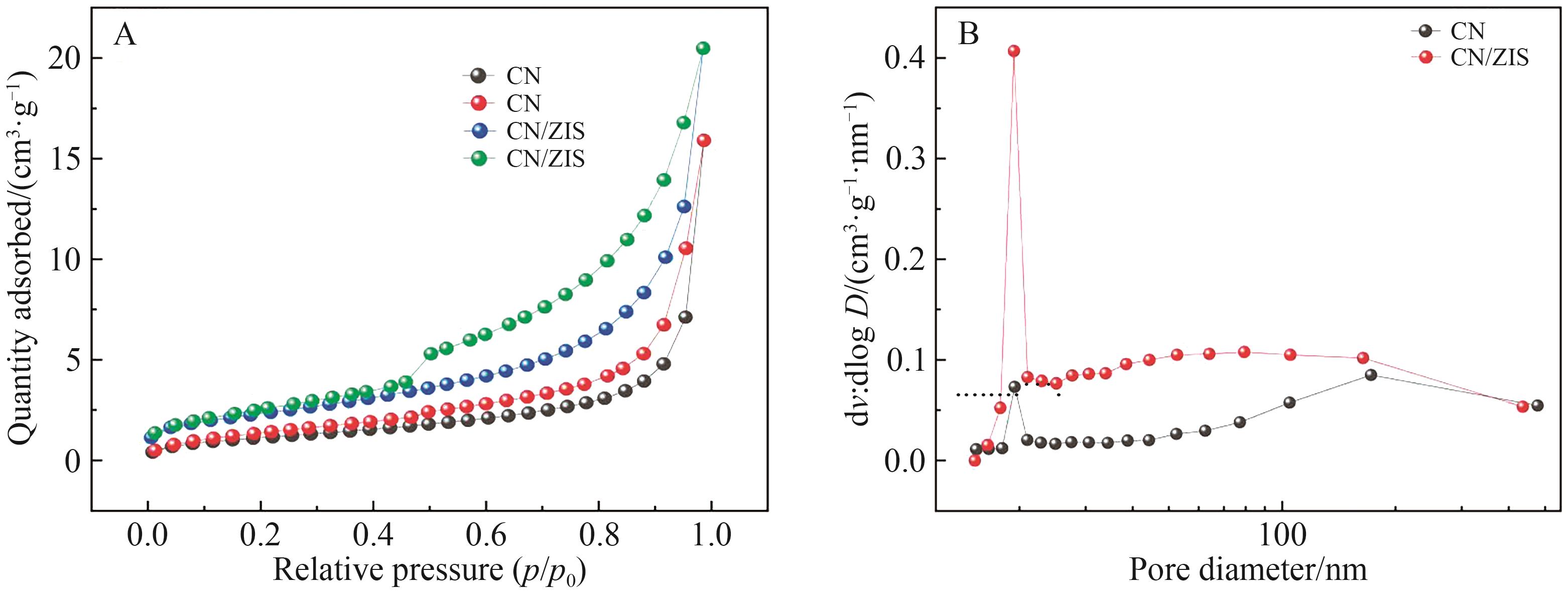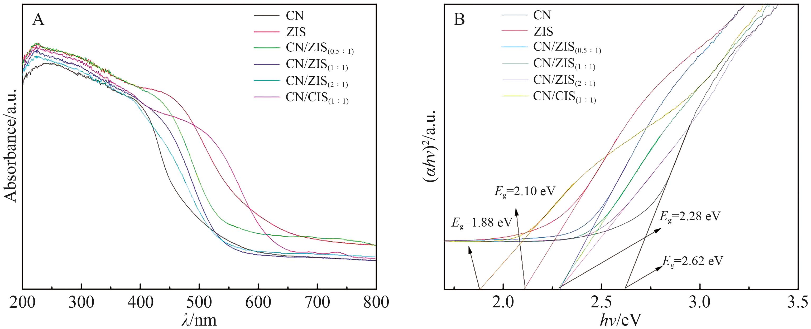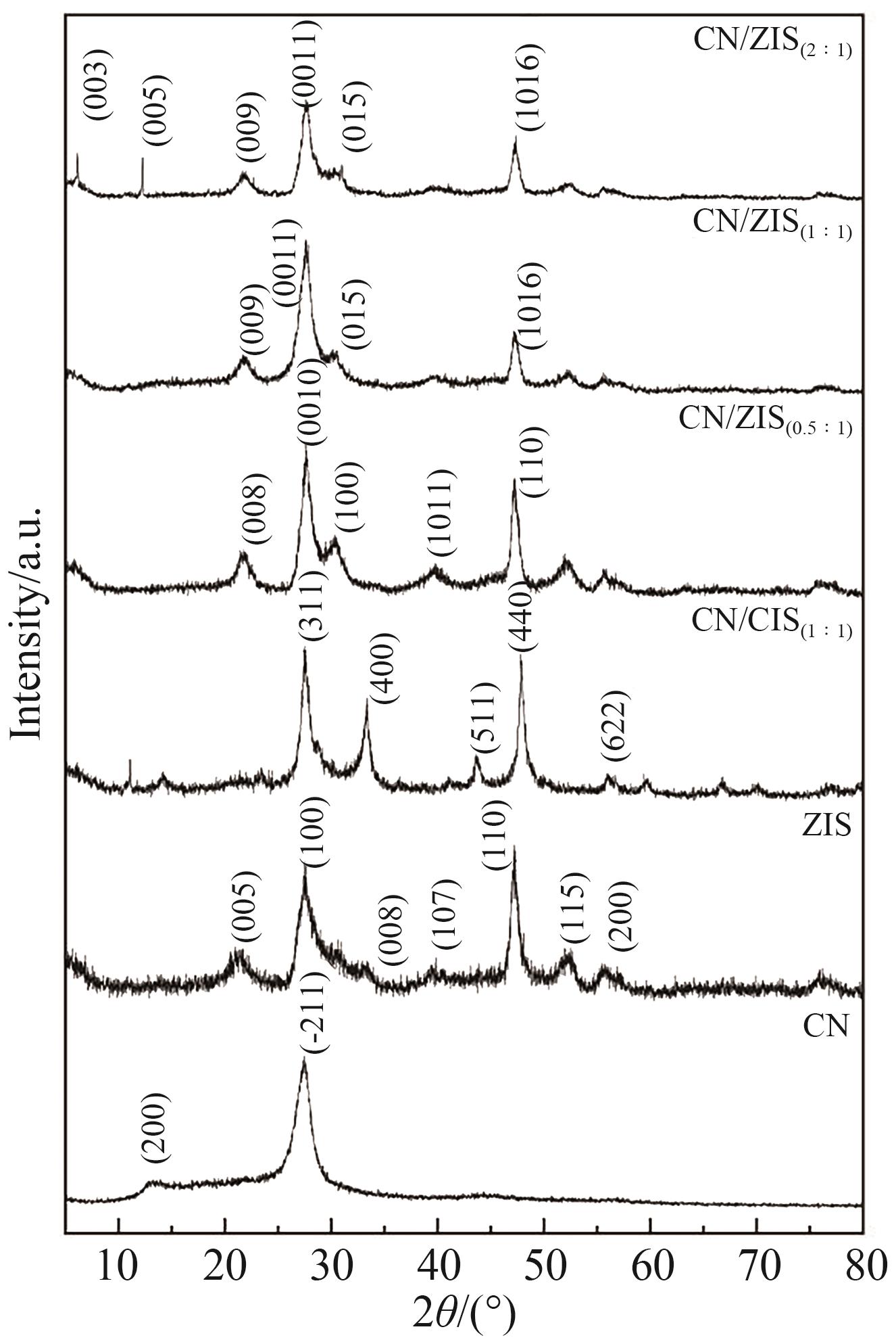 Hexavalent chromium compounds are widely used in the chemical industry and are difficult to degrade naturally. Using composite nanomaterials as photocatalysts to treat hexavalent chromium Cr(Ⅵ) shows high photocatalytic activity. g-C3N4/ZnIn2S4 and g-C3N4/CaIn2S4 nano heterojunction materials were prepared by hydrothermal method, and characterized by X-ray diffraction (XRD), scanning electron microscopy (SEM), physical adsorption analyzer (BET), UV-visible near-infrared spectroscopy (UV-Vis-NIR), X-ray photoelectron spectroscopy (XPS) and electron spin resonance (EPR). The reduction capacity of g-C3N4/ZnIn2S4 and g-C3N4/CaIn2S4 materials on Cr(Ⅵ) was tested in both non illuminated and visible light environments, and 1,4-benzoquinone (PBQ, 1 mmol), disodium ethylenediaminetetraacetic acid (EDTA-2 Na, 1 mmol) and tert-butanol (TBA, 0.5 mL) were used as scavengers for superoxide radicals(·O2-), holes(h+) and hydroxyl radicals (·OH). The active species of the photocatalytic reaction were determined based on the changes in the degradation concentration of Cr(Ⅵ) after capturing different radicals. The experimental results show that the g-C3N4/ZnIn2S4(1∶1) composite material and the g-C3N4/CaIn2S4(1∶1) composite material have the most significant catalytic effects on the reduction ability of Cr(Ⅵ), with degradation efficiencies reaching 95.5% and 60% respectively. Comparing the reduction ability of Cr(Ⅵ) by g-C3N4/ZnIn2S4 composite materials with different mass ratios (0.5∶1, 1∶1 and 2∶1), it was found that a 1∶1 g-C3N4/ZnIn2S4 composite material had the best catalytic effect,followed by 0.5∶1 and 2∶1, the degradation efficiency was 27% and 16%, respectively; Superoxide radicals (·O2-), photogenerated holes (h+) and hydroxyl radicals (·OH) all participate in the reaction, and the influence of free radicals is in the order of h+>·O2->·OH.