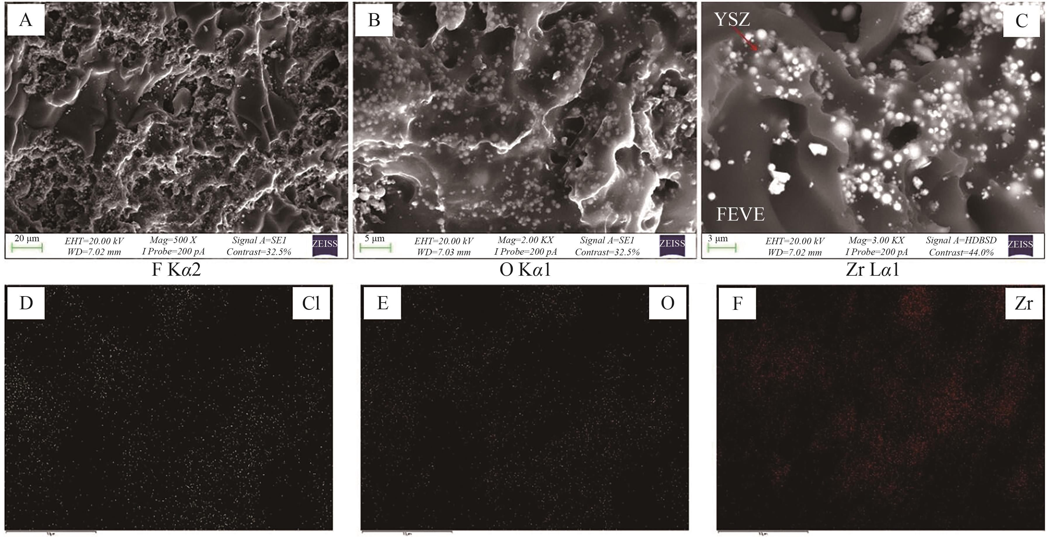 Fig.16 SEM of TBCs after being soaked composition a (A), composition b (B) and composition (C) for 10 days in the three compositions of fluorocarbon coating