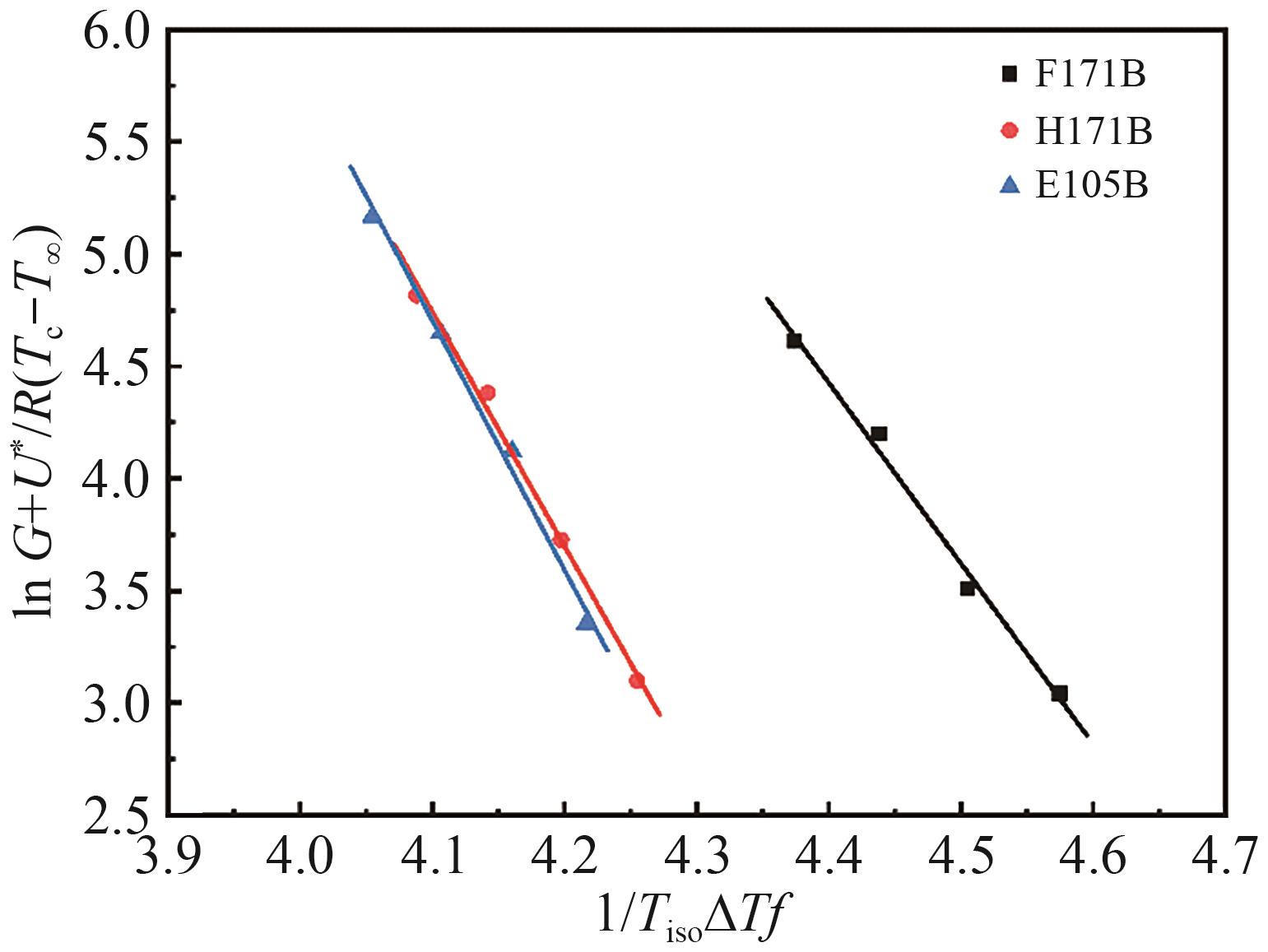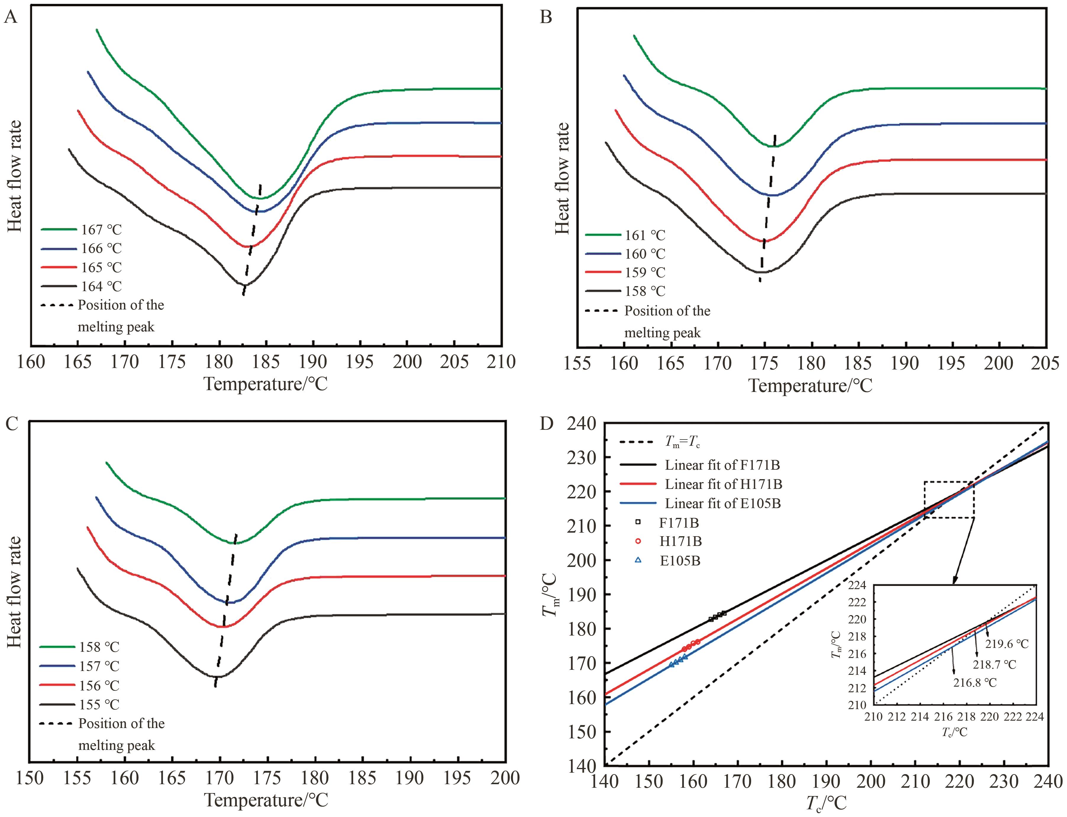 The isothermal crystallization kinetics and thermodynamics of three ethylene vinyl alcohol copolymers (EVOH) with different ethylene content (molar percent 32%, 38% and 44%) were studied by differential scanning calorimetry (DSC). The extrapolation curves of the dependence relationship between linear growth rate and crystallization temperature were obtained according to H-L theory. The results showed that with the increase of ethylene content, the equilibrium melting point of EVOHs decreased to 219.6, 218.7 and 216.8 ℃, respectively. The three EVOHs showed mixed growth characteristics of two-dimensional and three-dimensional in the primary crystallization, and one-dimensional growth in the secondary crystallization. The calculation of the fold surface free energy showed that ethylene segment has a blocking effect on the molecular chain folding of EVOHs. The crystallization rate of EVOHs slowed down with the increase of ethylene content under low subcooling condition. It was predicted that the crystallization rate of three different ethylene contents EVOHs reversed at about 135 ℃, and the fastest crystallization rate was found at 112, 104 and 101 ℃, respectively.