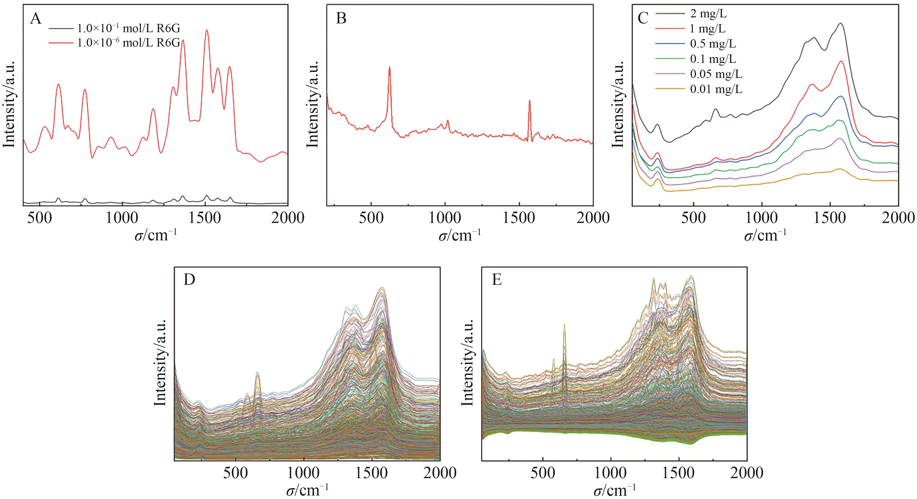 Fig.3 (A) Collected SERS spectrum of R6G solution; (B) Raman spectra of cypermethrin standard; (C) The average spectra samples with six concentration gradients; (D) Enhanced spectral data after S-G; (E) Enhanced spectral data after MC
