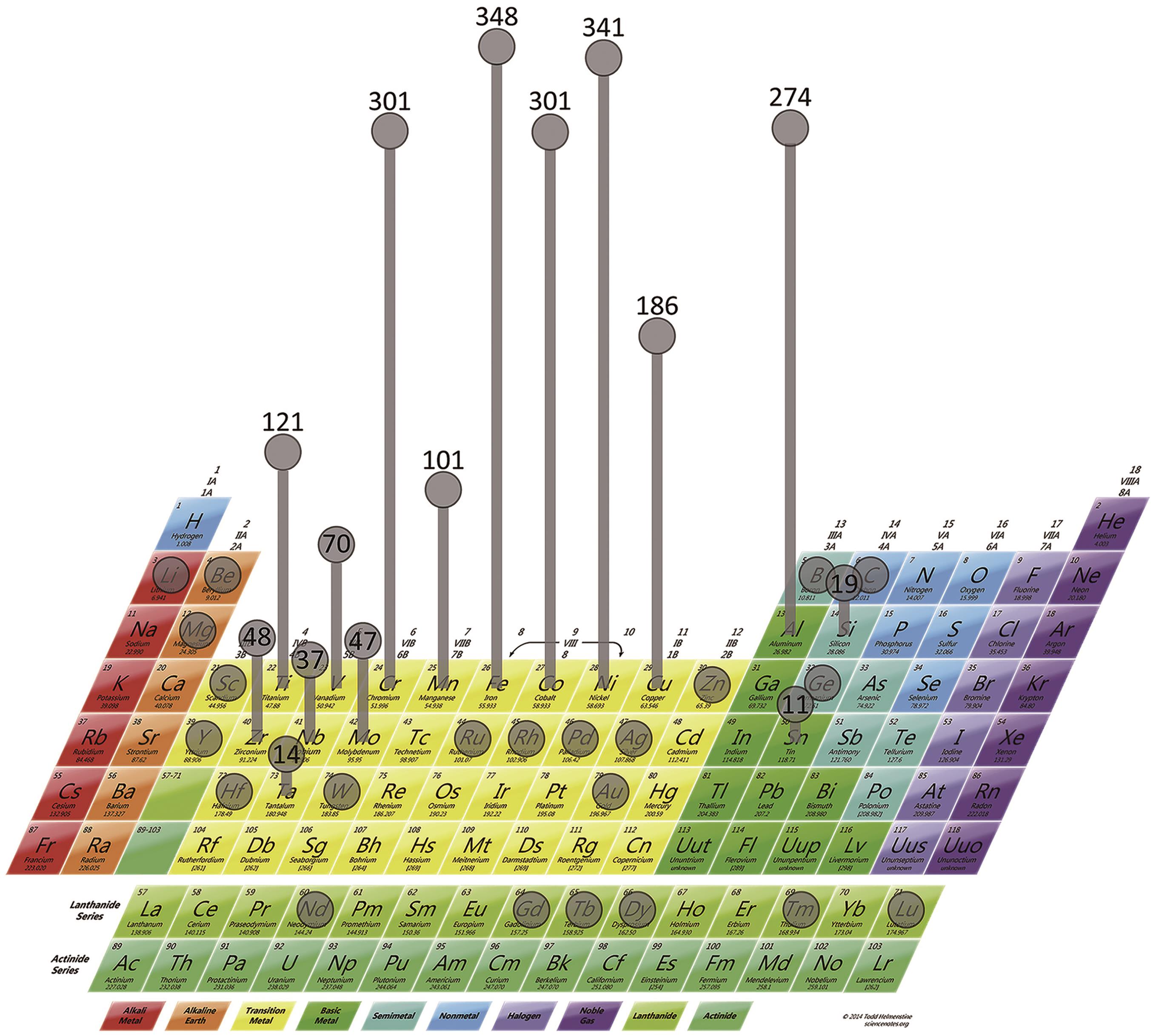 Fig.2 The frequency of use of 408 multiprimary alloy elements assessed. The vertical line is proportional to the number of alloys using the indicated element, which is also shown by the relevant numbers. When elements are used in fewer than 10 alloys, no number is given. Al, Co, Cr, Cu, Fe, Mn, Ni and Ti are by far the most commonly used elements[37]