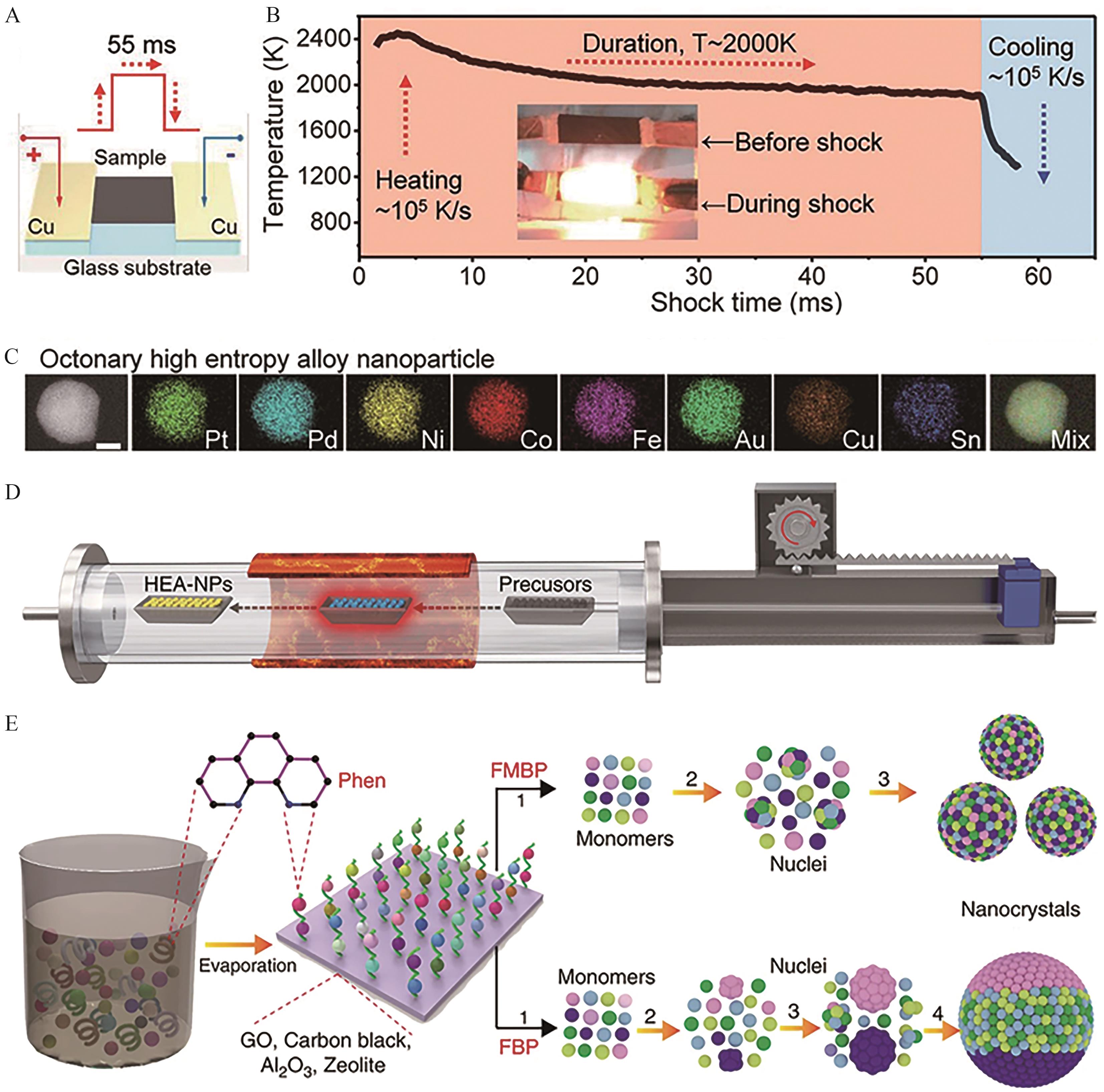 Fig.3 (A) CTS synthesis of HEA-NPs on carbon carriers; (B) Sample preparation and time evolution of temperature during 55 ms thermal shock; (C) An element diagram of HEA-NP consisting of eight different elements (Pt, Pd, Ni, Co, Fe, Au, Cu and Sn)[43]; (D) Schematic diagram of FMBP experimental apparatus for synthesizing HEA-NPs; (E) The schematics of homogeneous and phase-separated HEA-NPs synthesized by FMBP and FBP strategies, respectively[48]