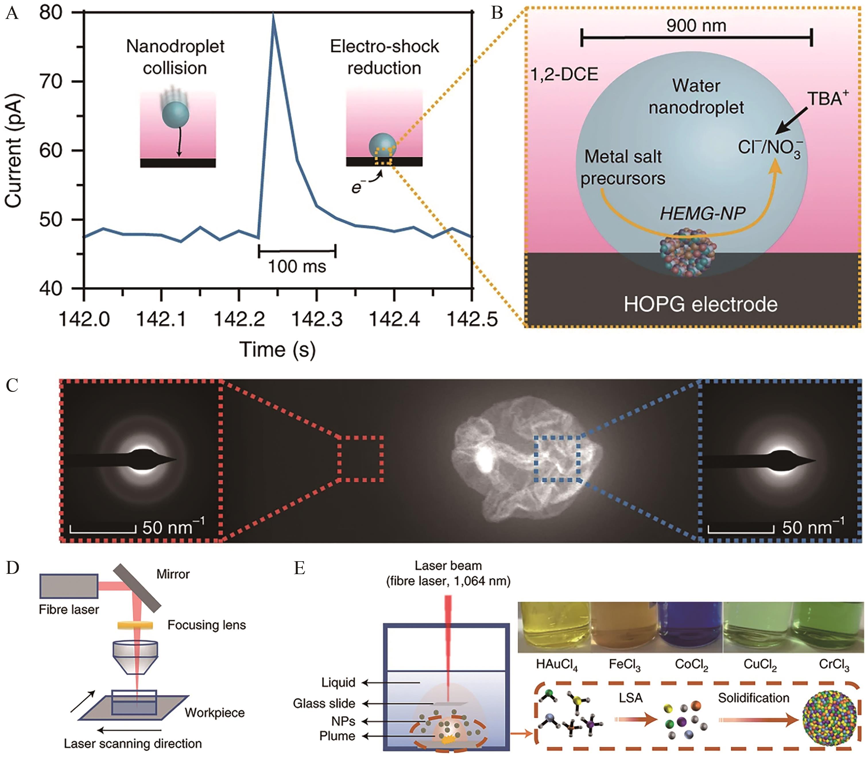 Fig.4 (A) Schematic illustration of nanodroplet mediated electrodeposition corresponding to the current transient of a single nanodroplet collision with a carbon fiber UME at a voltage of -0.4 V(vs.Ag/AgCl). The nanodroplet content decreased rapidly within 100 ms, which promoted the disordered co-deposition of various metal precursors; (B) Nanodroplet collision process; (C) The amorphous microstructure was confirmed by the lack of crystallinity at high resolution and the presence of diffusion rings on the SAED pattern[50]; (D) Schematic diagram of experimental setup for synthesis of AuFeCoCuCr NPs in hexane under pulsed fiber laser irradiation; (E) AuFeCoCuCr synthesis of NPs. Left: schematic diagram of the reaction on the CNF surface during the LSA process. Bottom right: reaction process to form HEA NP, top right: precursor loaded on CNF[53]