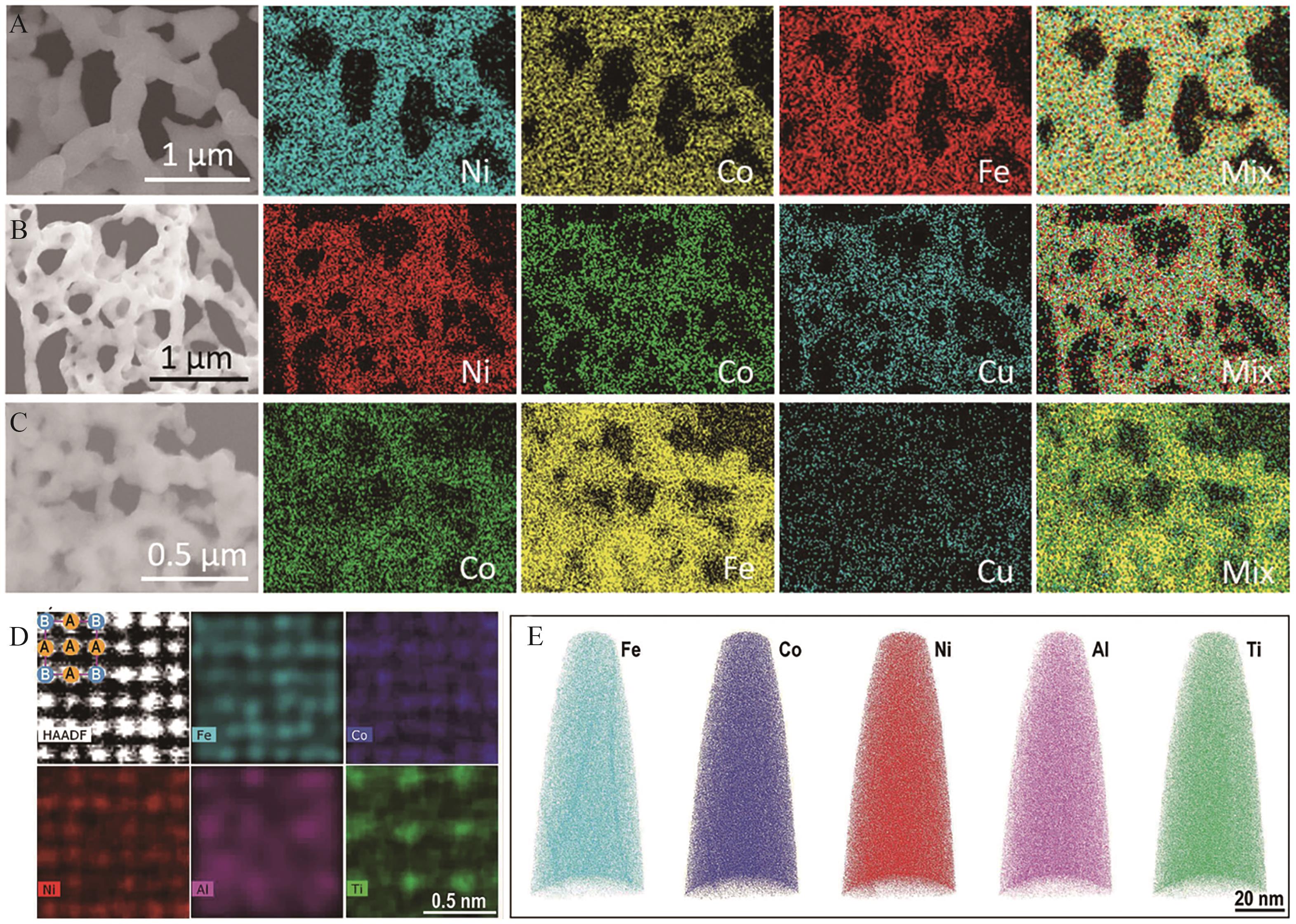 Fig.5 (A-C) SEM-mapping of different high entropy alloys; (D) High power HAADF-STEM images are accompanied by atomic resolution element diagrams[60]; (E) 3D-APT diagram showing the distribution and multi-component properties of L12 HEI elements[61]