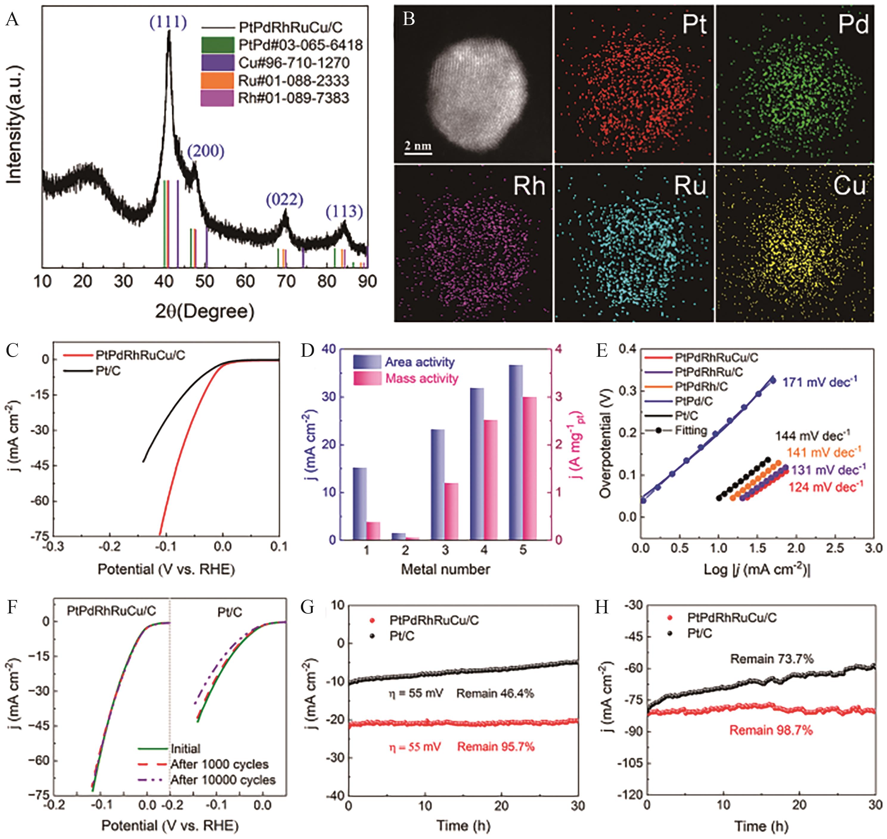 Fig.7 (A) XRD pattern of PtPdRhRuCu/C; (B) PtPdRhRuCu element distribution of NPs. HER polarization curves of PtPdRhRuCu/C, PtPdRhRu/C, PtPdRh/C, PtPd/C and Pt/C in 1 mol/L; (C) Area activity (normalized to electrode geometric surface area, at -0.07 V(vs.RHE)) and mass activity (normalized to Pt mass) (D) and Tafel slope (E); (F) HER polarization curves of PtPdRhRuCu/C and Pt/C before and after CV cycle in 1 mol/L; (G) Chronoamperometric tests of PtPdRhRuCu/C and Pt/C at 55 mV overpotential in 1 mol/L; (H) PtPdRhRuCu/C and Pt/C at different overpotentials for the initial timing amperage test current density[64]