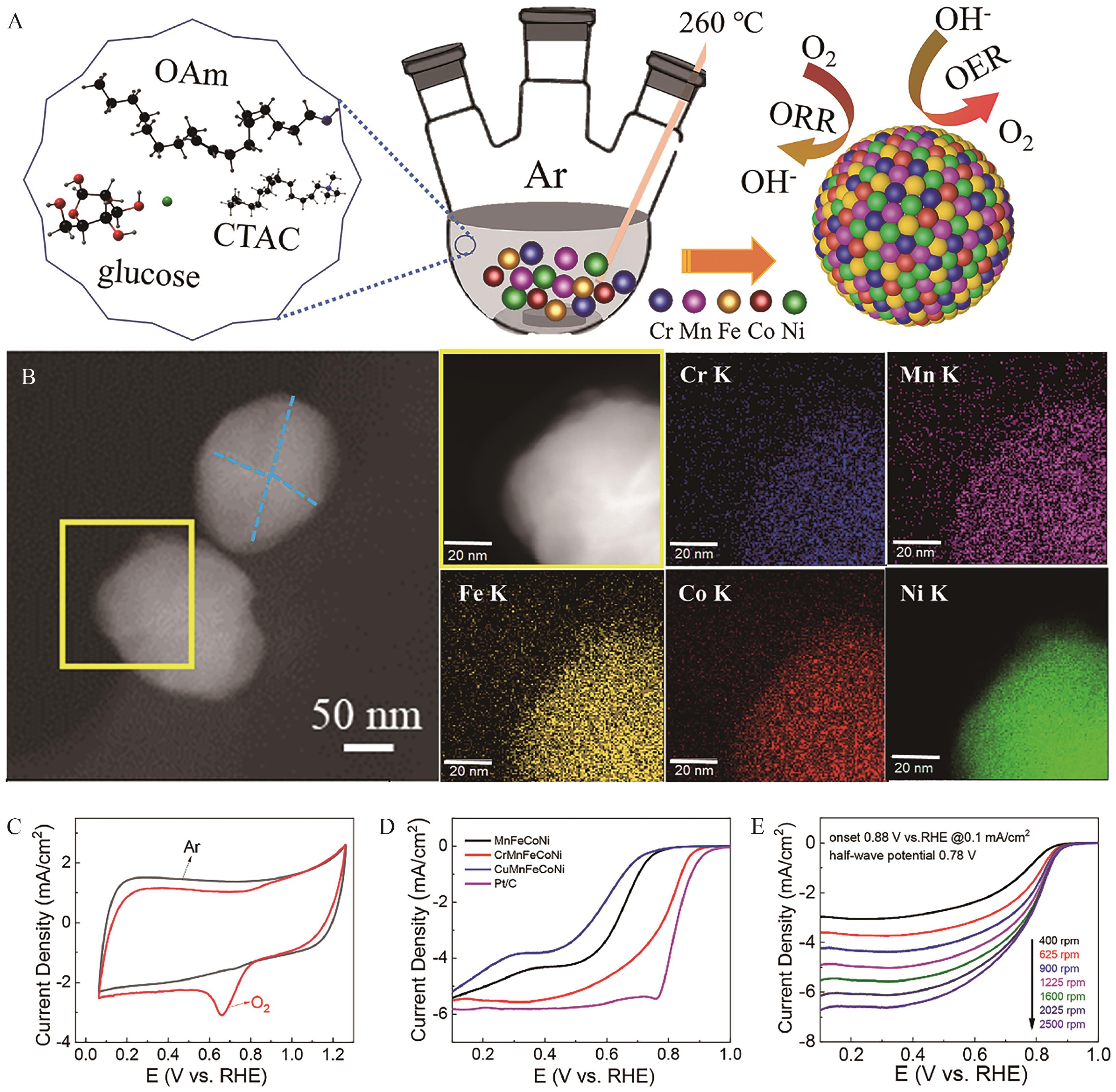 Fig.8 (A) Diagram of high entropy alloy synthesis process; (B) TEM image and EDS chemical composition map; (C) CV curves measured in Ar and O which are 2 saturated electrolytes; (D) ORR polarization curves of different electrodes; (E) LSV curves at different speeds[70]