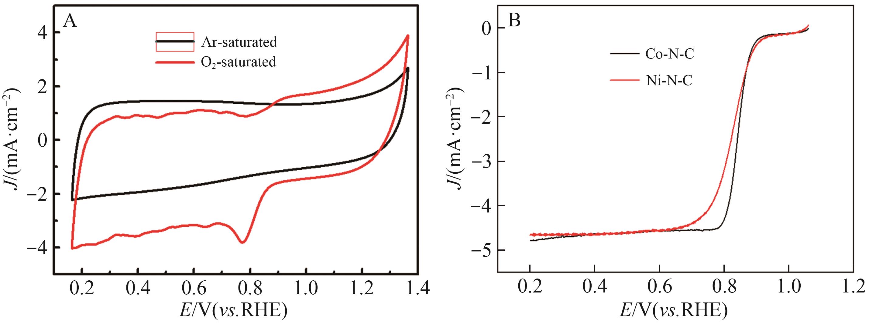 Fig.4 (A) Cyclic voltammetry curves of Co-N-C in Ar/O2-saturated 0.1 mol/L KOH at a speed of 50 mV/s; (B) Linear sweep voltammetry curve of Co-N-C and Ni-N-C in O2-saturated 0.1 mol/L KOH at a speed of 1600 r/min at a scanning rate of 5 mV/s, respectively