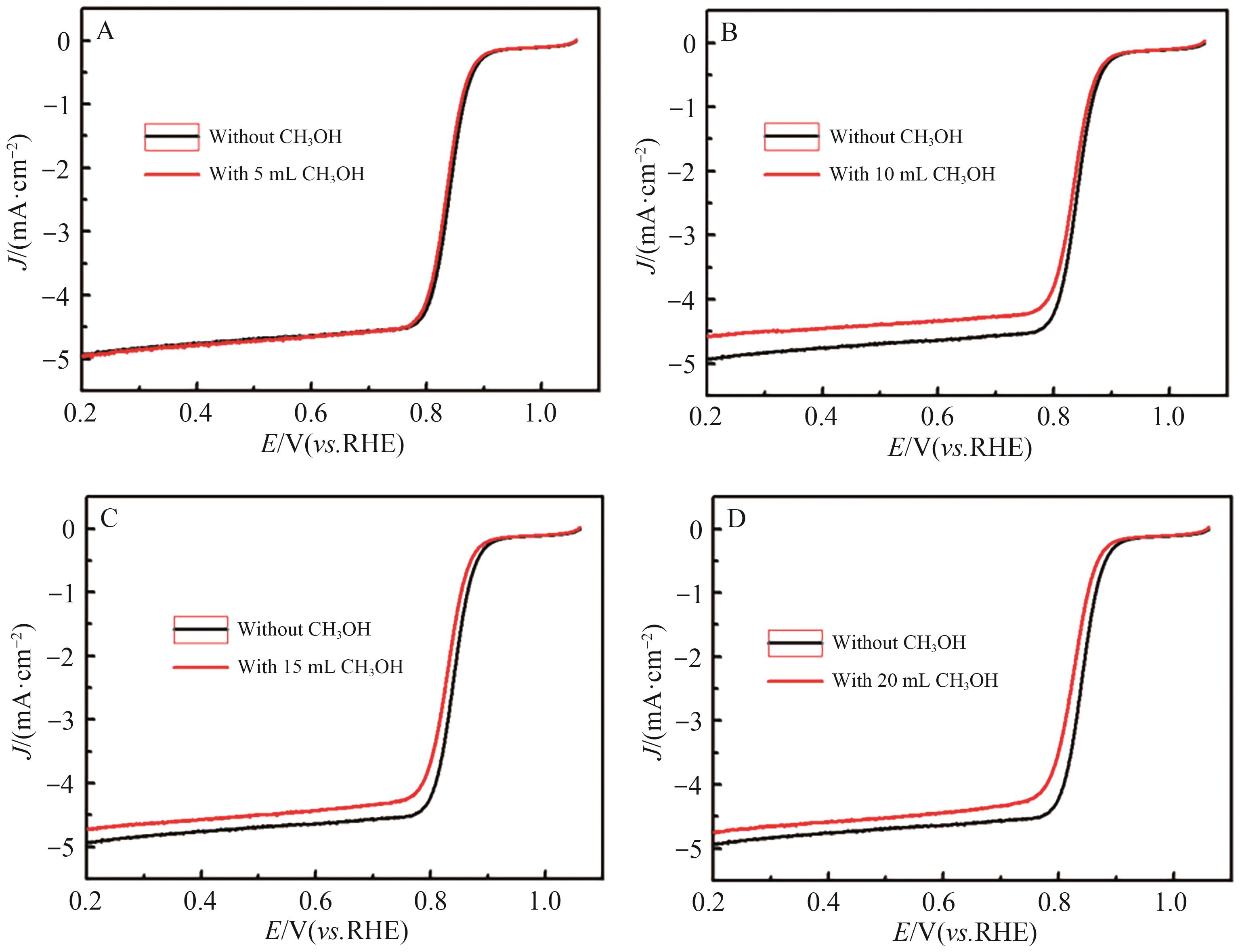 Fig.5 Linear sweep voltammetry curves of Co-N-C in O2-saturated 0.1 mol/L KOH and 0.1 mol/L KOH/1.0 mol/L CH3OH with methanol: (A) 5, (B) 10, (C) 15 and (D) 20 mL