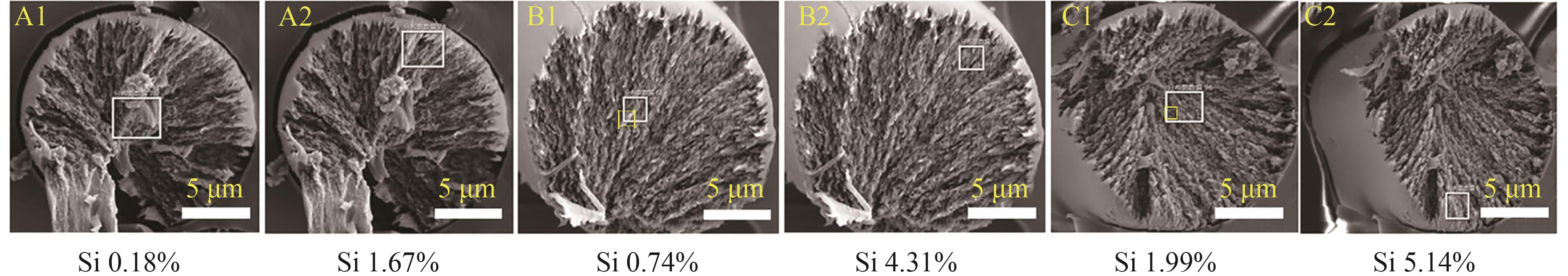 Fig.3 Cross-sectional morphology images of composite fibers with QA-POSS additions of 2.5% (A1, A2), 5% (B1, B2), and 10% (C1, C2). Quantitative analysis of Si element content in the central regions (A1, B1, C1) and edge regions (A2, B2, C2) of the fibers