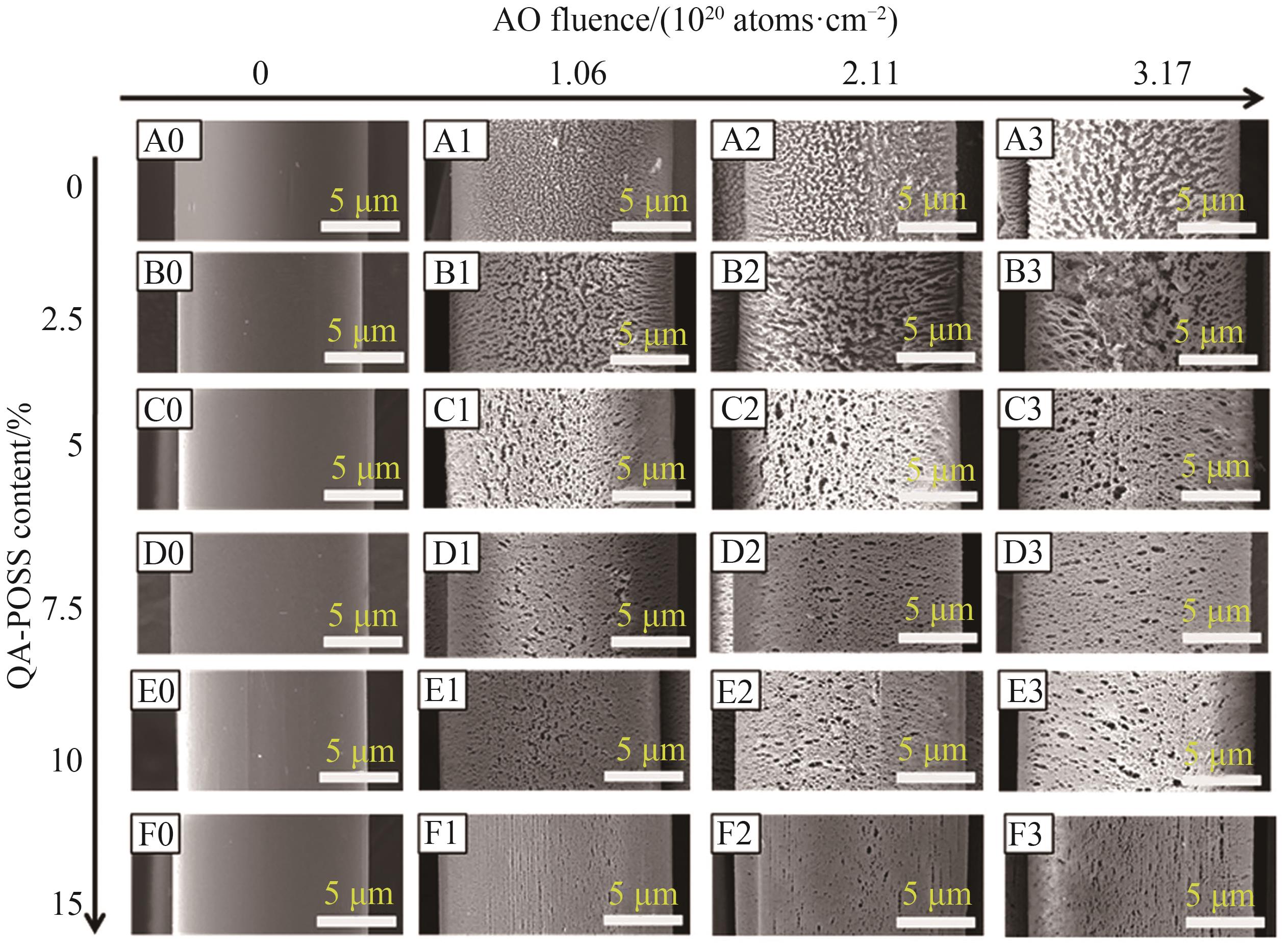 Fig.6 Surface morphologies of (A0-A3) blank PI fiber, composite fibers with (B0-B3) 2.5% QA-POSS, (C0-C3) 5% QA-POSS, (D0-D3) 7.5% QA-POSS, (E0-E3) 10% QA-POSS, and (F0-F3) 15% QA-POSS additive amount before and after AO erosion