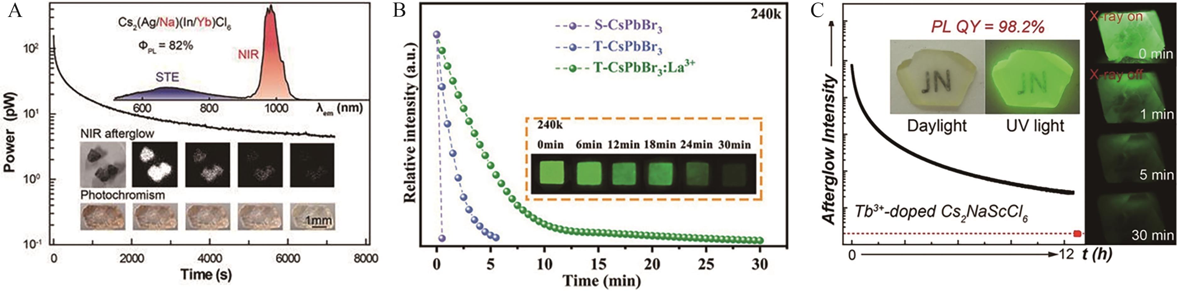 Fig.2 (A) The long persistent luminescence decay curve at 996 nm of Cs2Na0.2Ag0.8InCl6∶Yb3+ crystal within 2 h[30]; (B) Normalized long persistent luminescence decay curves of different NCs[32]; (C) Long persistent luminescence decay curve of Cs2NaScCl6∶Tb3+ [33]