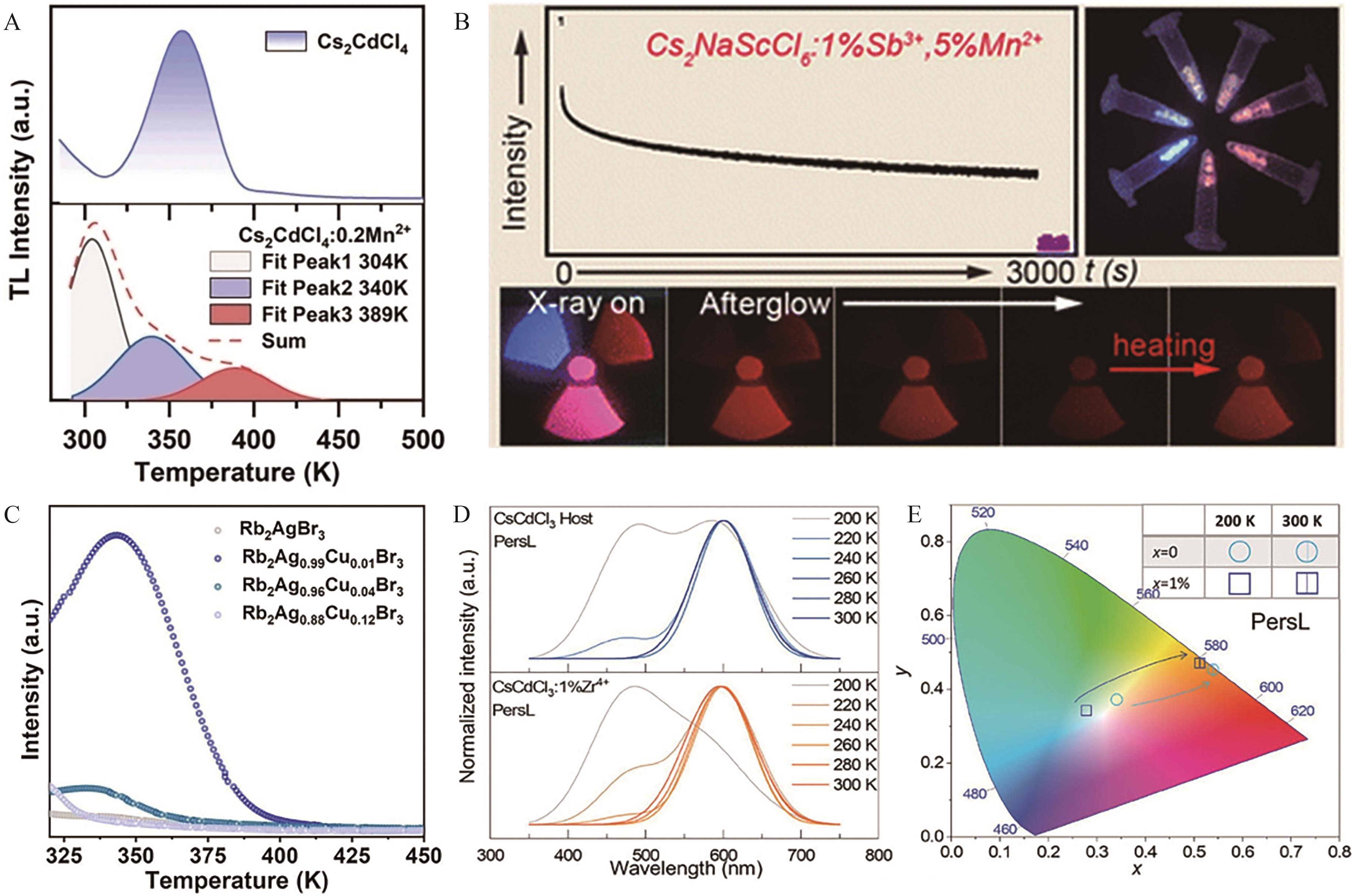 Fig.3 (A) TL curve and decomposed Gaussian fitting curve of Cs2CdCl4∶0.2Mn2+[36]; (B) Long persistent luminescence decay curve of Cs2NaScCl6∶1%Sb3+,Mn2+ crystal[37]; (C) TL curves of Rb2Ag1-x Cu x Br3 (x=0, 0.01, 0.04, 0.12)[38]; (D) Normalized long persistent luminescence spectra of CsCdCl3 and CsCdCl3∶1%Zr4+ after being charged with a 254 nm ultraviolet lamp for 1 min at different ambient temperature[39]; (E) Chromaticity coordinates of CsCdCl3∶xZr4+ (x=0 and 1%) at 200 and 300 K[39]