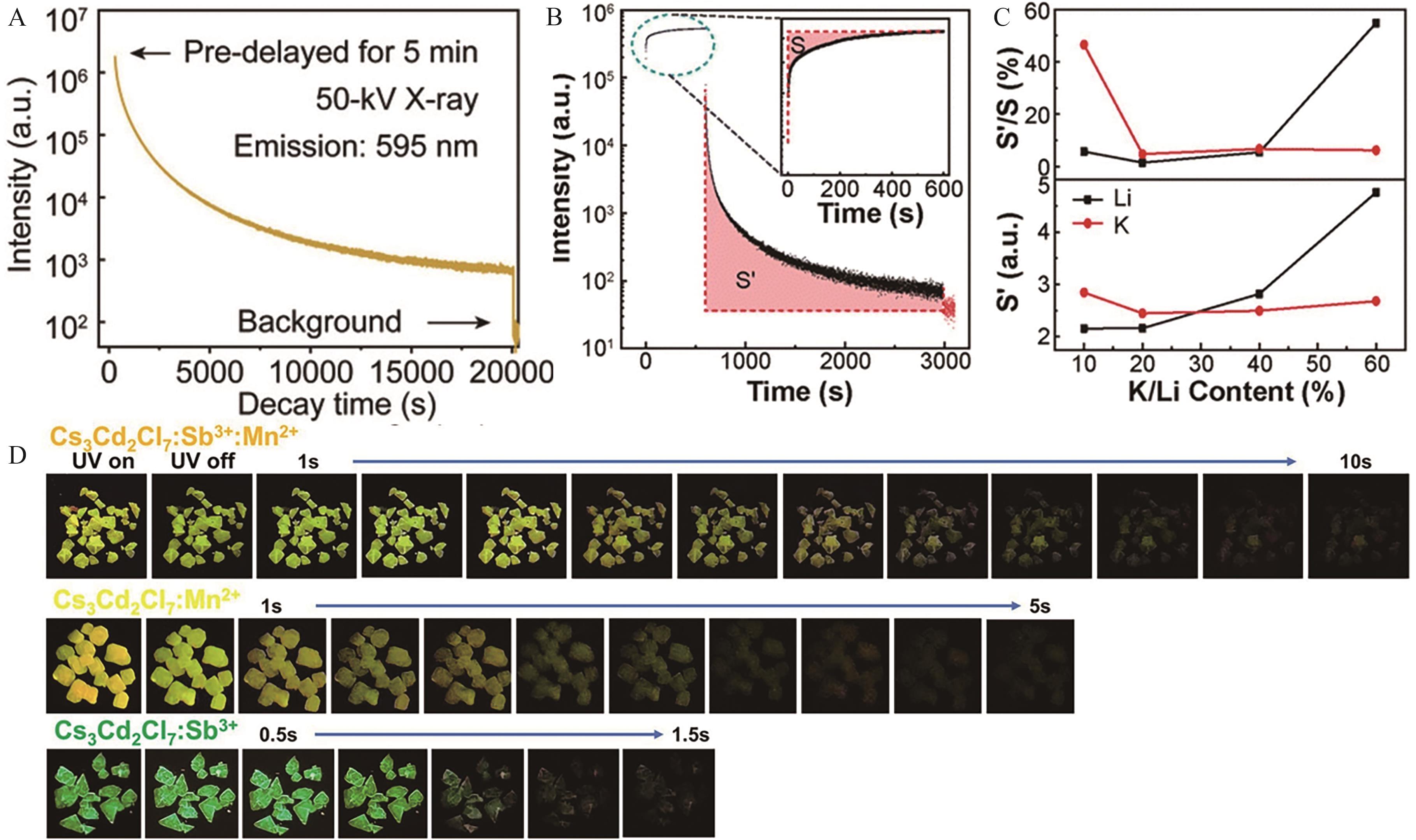 Fig.4 (A) Long persistent luminescence decay curve of Cs2NaInCl6∶3%Ag,3%Bi after pre-irradiated by X-ray (50 kV)[41]; (B) Long persistent luminescence decay curve of Cs2K0.6Ag0.4InCl6∶20%Mn crystal. The inset shows the rising stage after charging under 355 nm excitation. S and S′ represent the total charging energy and the released persistent luminescence energy, respectively[42]; (C) Plot of S′ and S against the doping mole fraction of alkali metal ions[42]; (D) Photographs of long persistent luminescence of Cs3Cd2Cl7 single crystals doped with different ions[44]