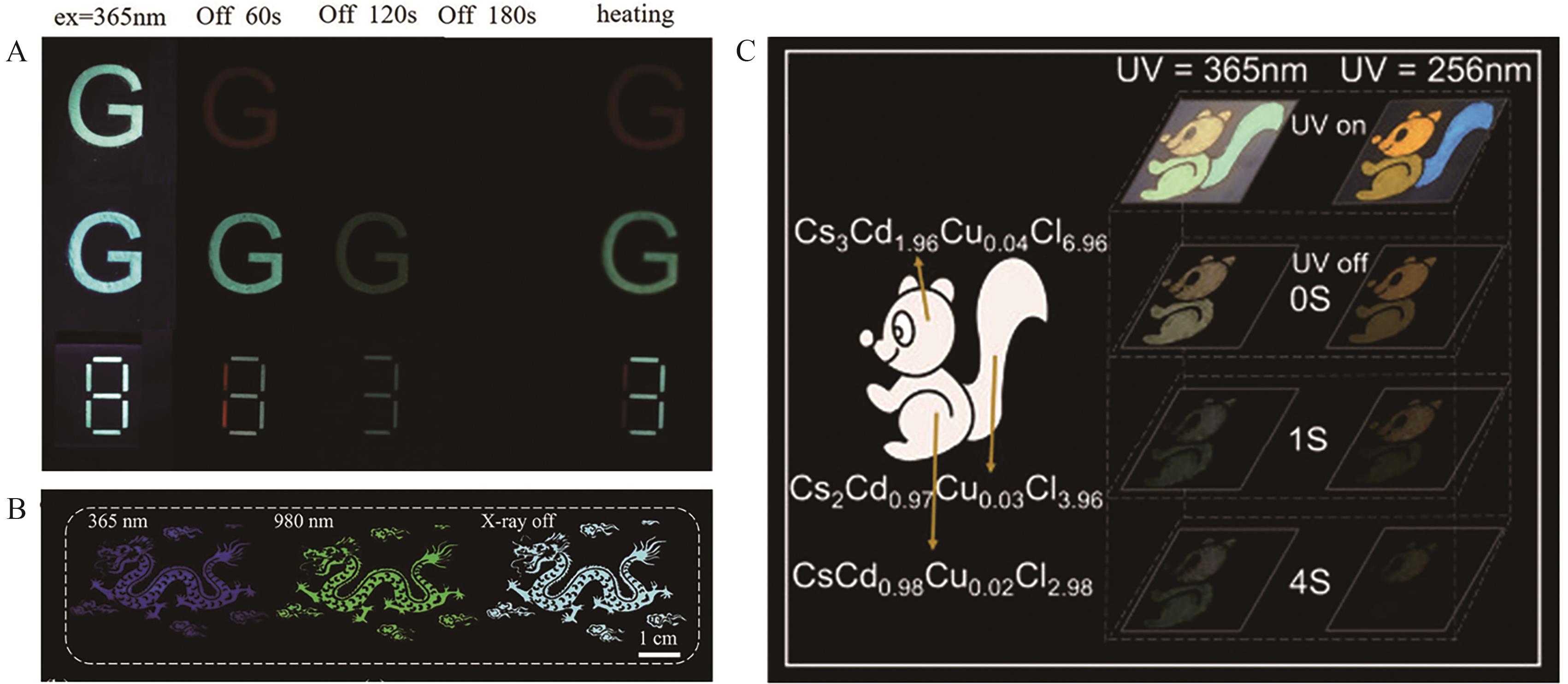 Fig.5 (A) Photographs of the letter “G” and the number “8” made from CsCdCl3∶0.1%Sb3+ and CsCdCl3∶1%Sb3+ samples[45]; (B) The “dragon”-shaped pattern fabricated by coating Cs2NaYb0.94Er0.06 NCs on a black iron plate[46]; (C) Squirrel pattern images under 256 and 365 nm ultraviolet light excitation, captured at different delay times after the cessation of excitation[47]