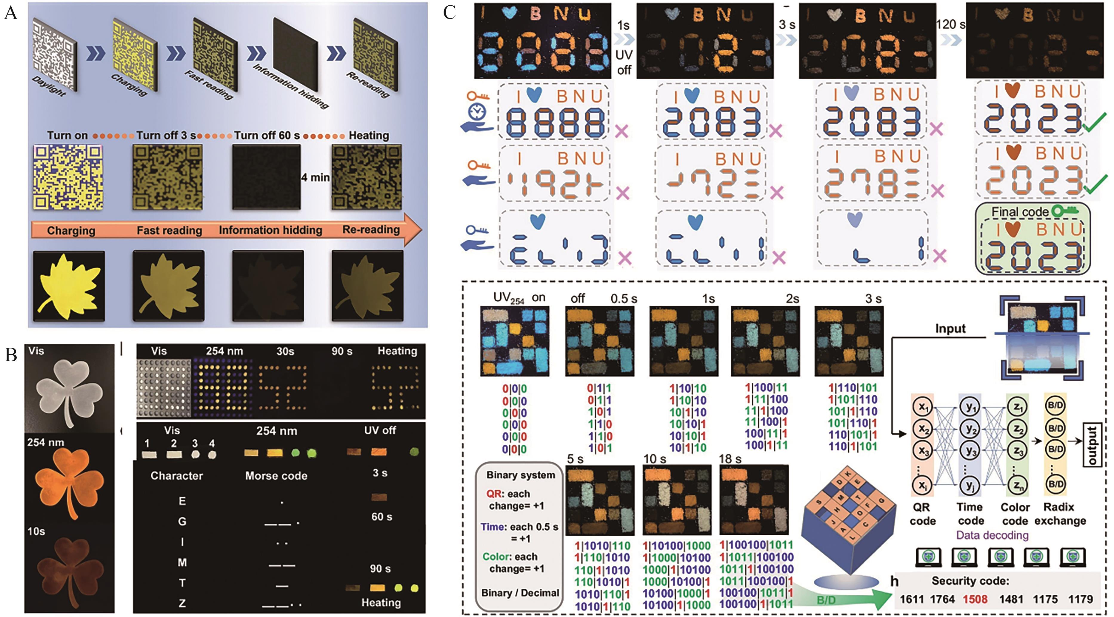 Fig.6 (A) Schematic diagram of dual-mode information storage-readout based on CsCdCl3 sample[48]; (B) Information storage and complex encryption application of CsCdCl3∶Mn2+ [49]; (C) Time valve controlled CsCdCl3∶x%Br- and CsCdCl3∶x%Sn2+ for multilevel information encryption and storage[50]