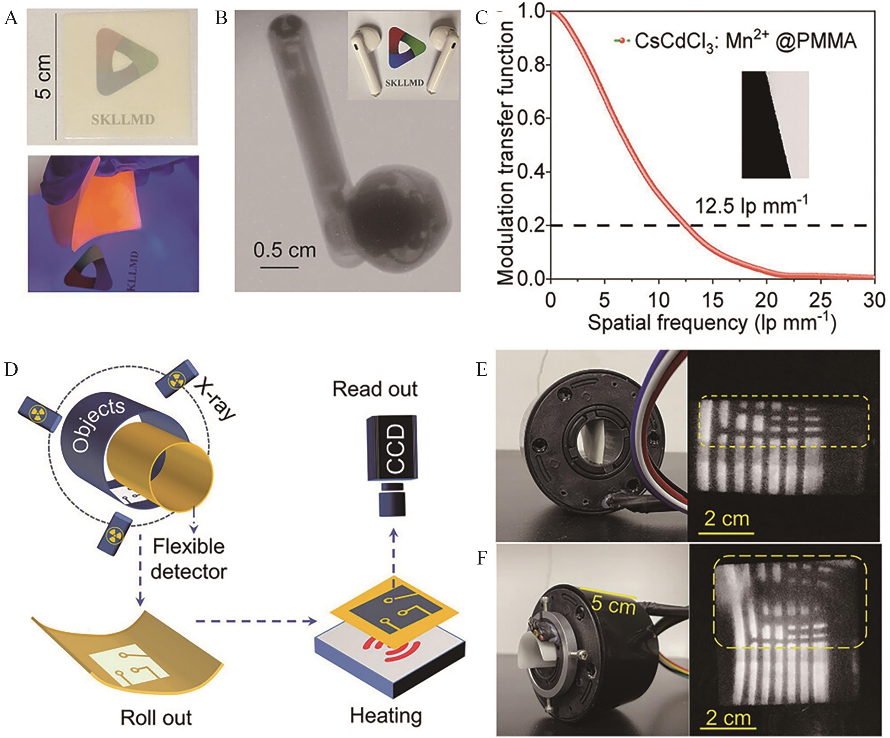 Fig.7 Schematic of X-ray detectors based on CsCdCl3∶5%Mn2+,0.1%Zr4+ for imaging [54]. (A) Photographs of PMMA-polymer film with CsCdCl3∶5%Mn2+,0.1%Zr4+ crystals under ambient light and ultraviolet light;(B) X-ray images of an earphone; (C) The MTF curve of the film and its resolution; (D) Schematic diagram showing nondestructive inspection of 3D curved objects enabled by the PDMS-polymer film with CsCdCl3∶5%Mn2+,0.1%Zr4+ crystals; (E) Imaging of annulus electric conduction link using the flat-panel PDMS-polymer film (5 cm×2.5 cm); (F) Curved planar reformation of the annulus electric conduction link using high flexible PDMS-polymer film (5 cm×5 cm). The image read out temperature is 100 ℃