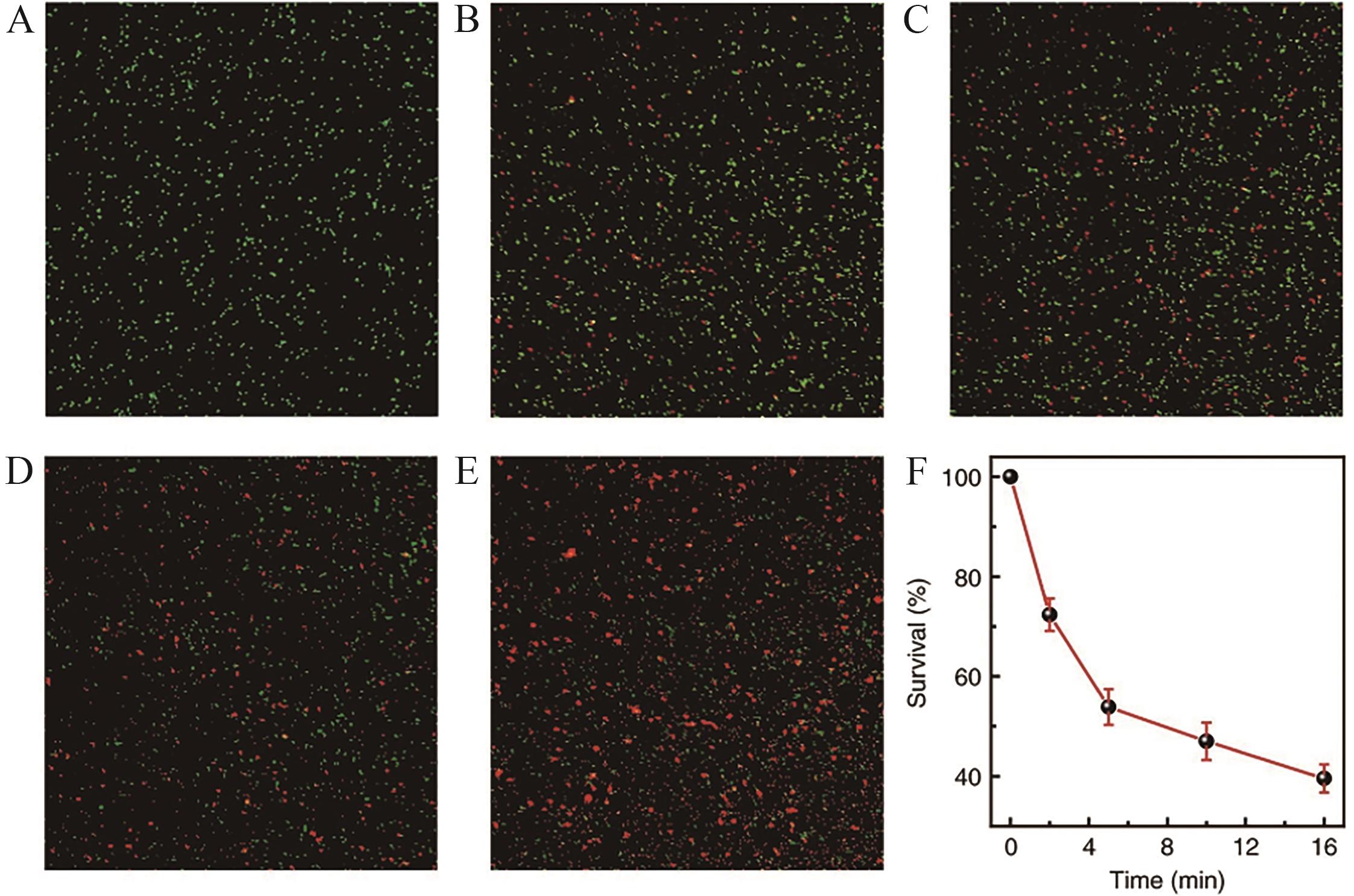 Fig.8 (A-F) Inactivation of Pseudomonas aeruginosa PAO1 using UVC-long persistence luminescence phosphor sheets[56]. Confocal micrographs of Pseudomonas aeruginosa PAO1 (A) under ambient conditions, irradiated with X-rays for (B) 2 min, (C) 5 min, (D) 10 min and (E) 16 min. Live cells and dead cells are shown in green and red, respectively; (F) Dependence of the survival rate of Pseudomonas aeruginosa PAO1 on the X-ray irradiation time of the given phosphor sheet