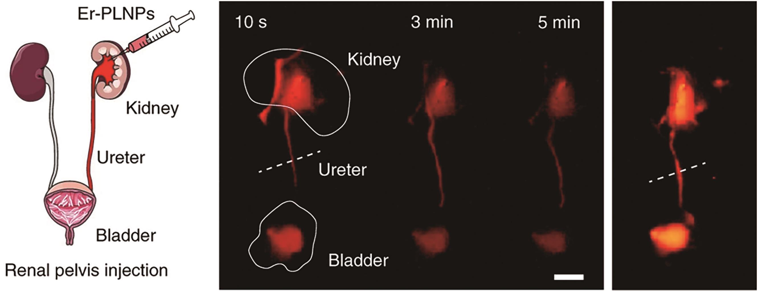 Fig.9 Time-dependent NIR-Ⅱ persistent luminescence (center) and NIR-Ⅱ PL (right) images of a ureter in a living mouse after renal pelvic injection of Er-PLNPs (left). Scale bar: 100 μm[58]
