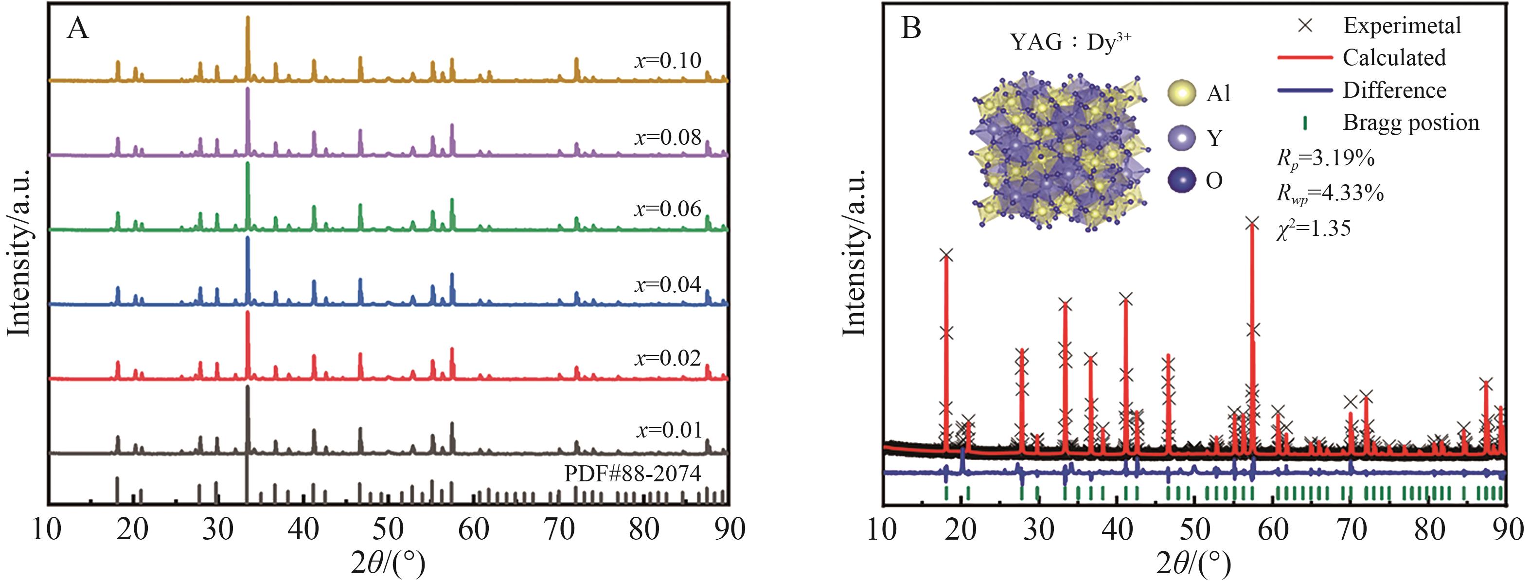 Fig.1 (A) XRD patterns of YAG∶xDy3+ (x=0.01, 0.02, 0.04, 0.06, 0.08, 0.10) samples; (B) Rietveld-refined XRD pattern of YAG∶Dy3+ phosphors (the inset shows the crystal structure of YAG∶Dy3+, where the yellow, purple, and blue spheres represent Al, Y, and O atoms, respectively)