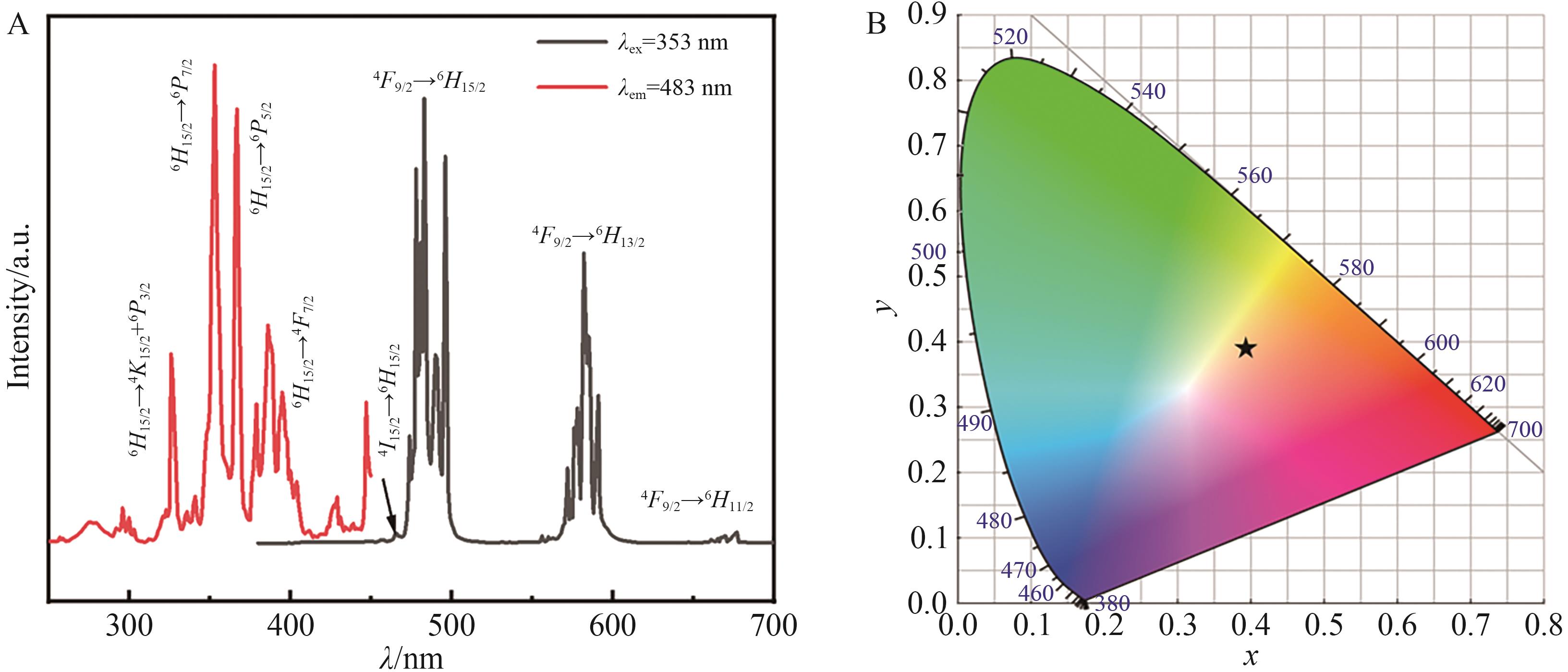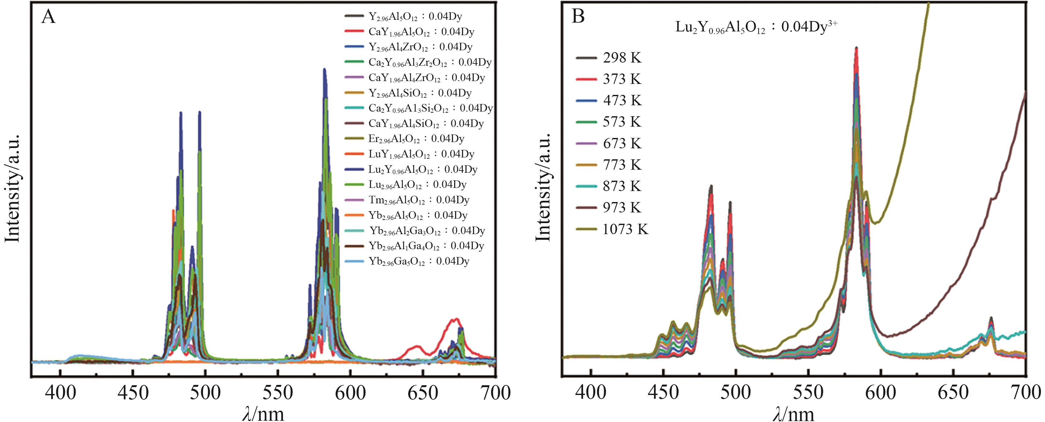 Fig.8 (A) PL spectra of YAG∶Dy3+ phosphors after matrix modification; (B) Temperature-dependent luminescence curves of Lu2Y0.96Al5O12∶0.04Dy3+ phosphors in the temperature range of 298~1073 K