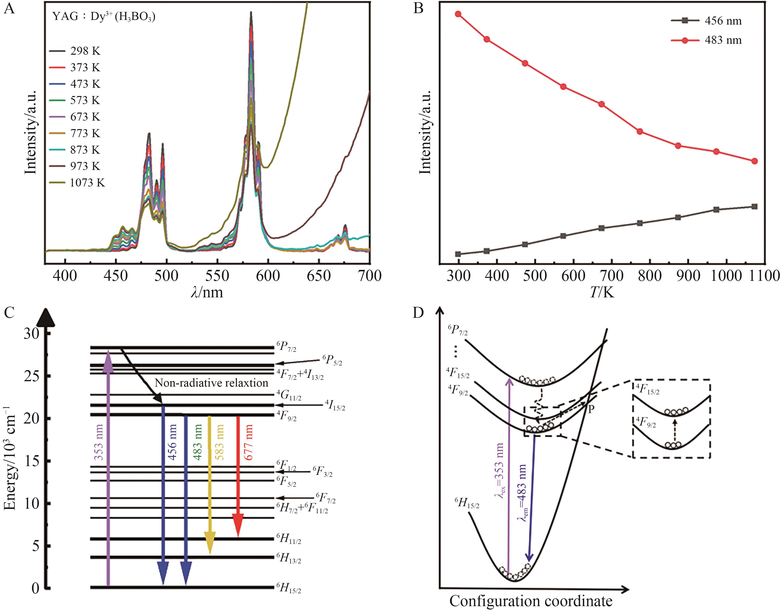 Fig.5 (A) Temperature-dependent PL spectra of YAG∶Dy3+ phosphors; (B) Intensity changes of the emission peaks of YAG∶Dy3+ phosphors at 456 and 483 nm in the temperature range of 298~1073 K; (C) Schematic diagram of the luminescence energy levels of Dy3+ ions; (D) Schematic diagram of the configurational coordinate of Dy3+