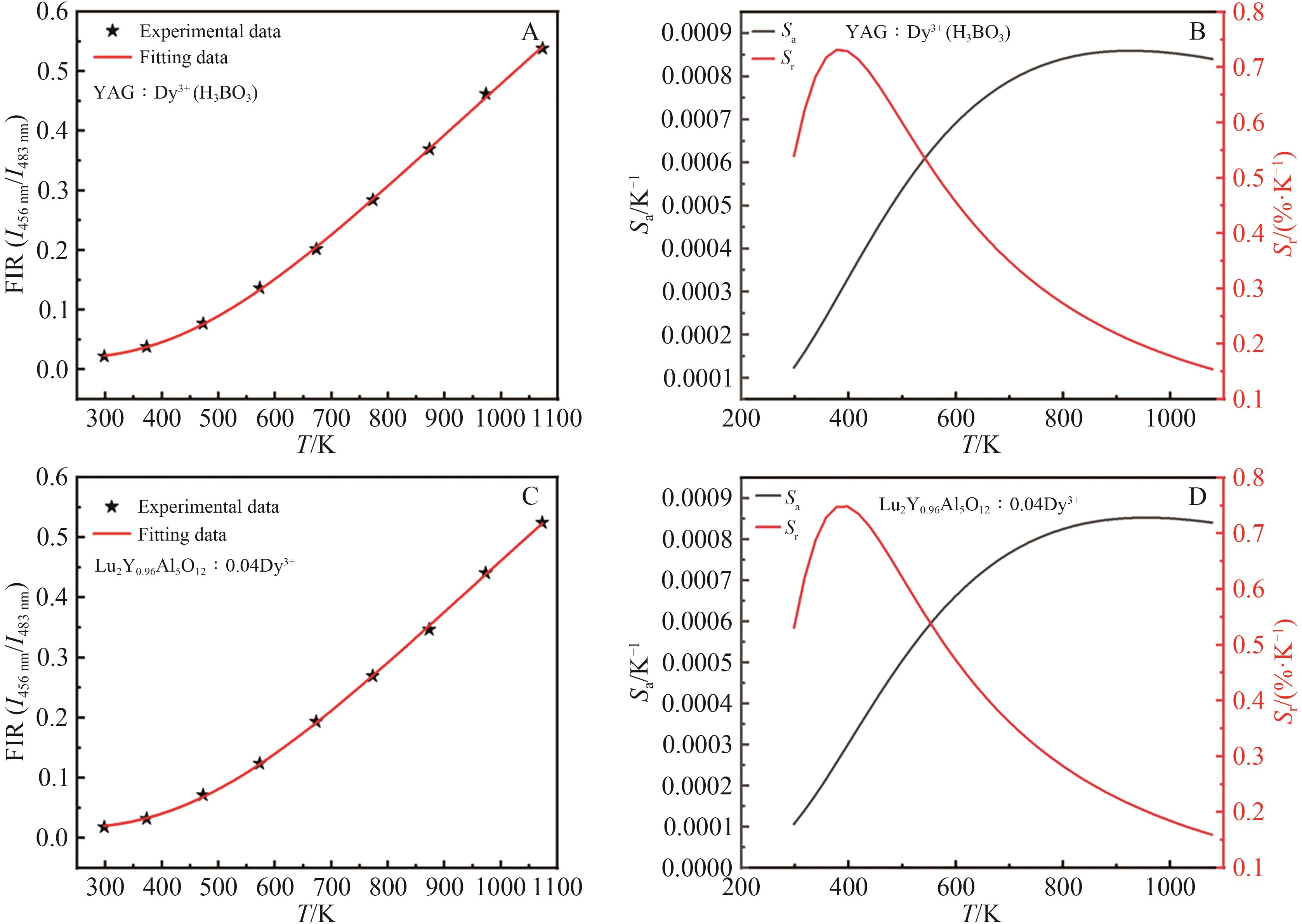 Fig.9 (A,B) FIR fitting curves of YAG∶Dy3+(H3BO3) phosphors and their corresponding thermometric absolute sensitivity (Sa) and relative sensitivity (Sr) values; (C,D) FIR fitting curves of Lu2Y0.96Al5O12∶0.04Dy3+ phosphors and their Sa and Sr