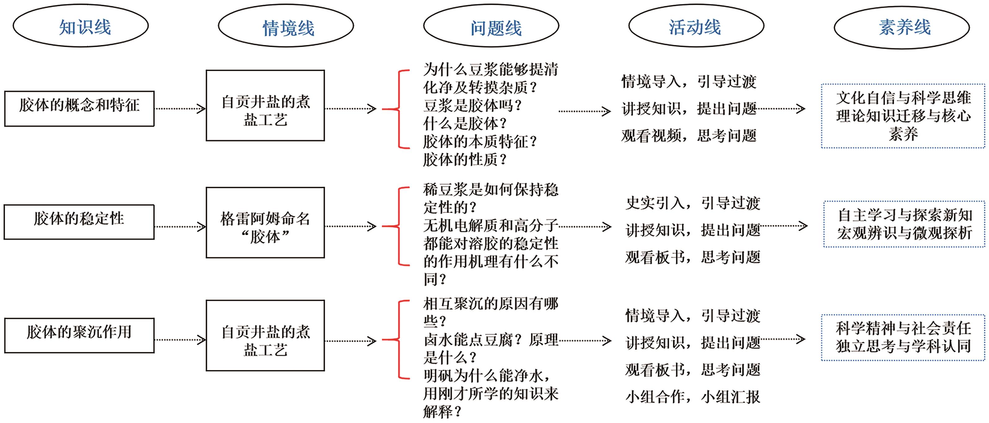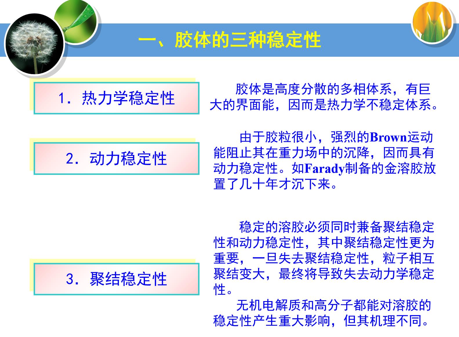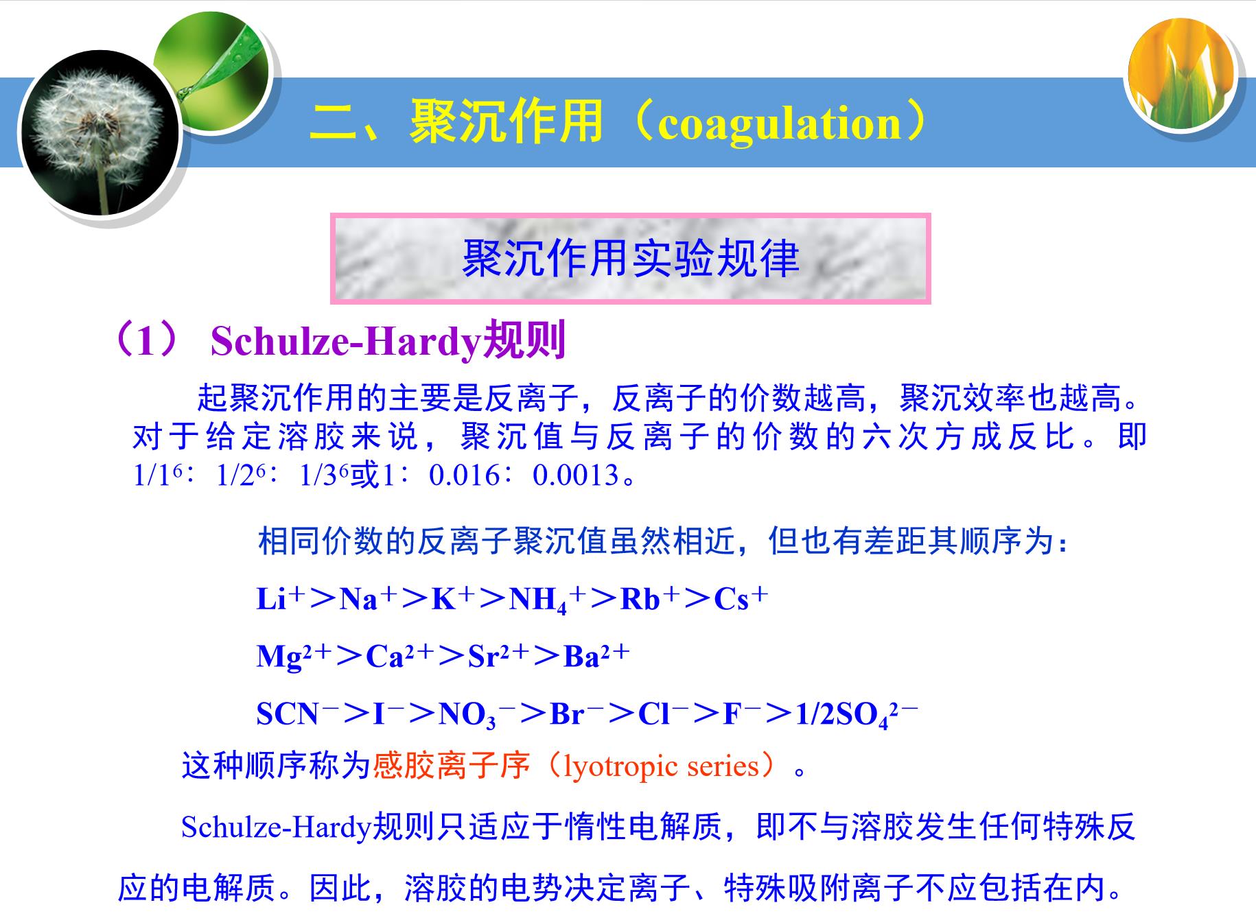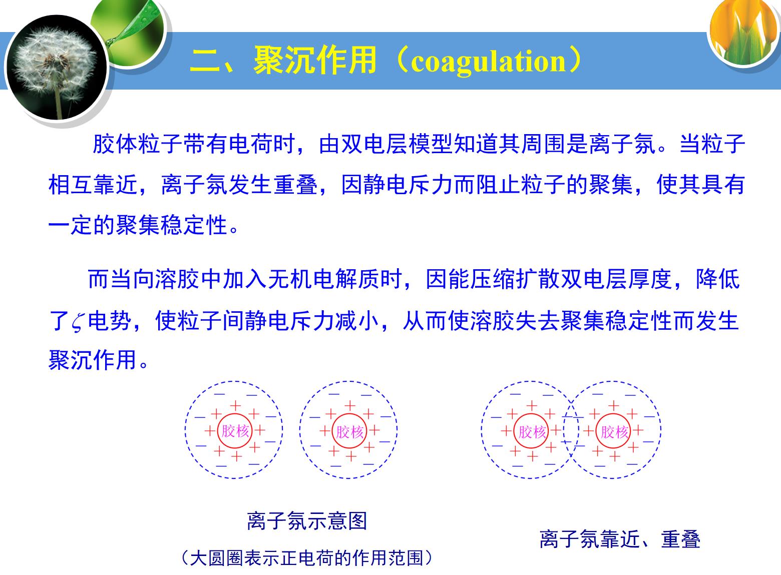 【设问1】相互聚沉的原因有哪些? 【设问2】卤水能点豆腐?原理是什么? 【小组讨论】明矾为什么能净水,用刚才所学的知识来解释? | 看教师通过教材和教学资料编撰的教学PPT,思考问题 【回答1】相互聚沉的原因可能有2种: ① 2种胶粒电性中和;② 2种胶粒的稳定剂相互发生破坏(如沉淀)。 此外,溶胶的浓度也影响电解质的聚沉值。通常对一价反离子来说,溶胶稀释时聚沉值增加,二价反离子不变,三价反离子降低(Burton-Bishop规则)。 【回答2】卤水的学名叫盐卤,是氯化镁、硫酸镁和氯化钠的混合物。 所谓“点”豆腐,就是在蛋白质胶体中加入足够的电解质,用电解质中带正电荷的钙镁离子中和蛋白质胶粒所带的负电荷。由于蛋白质分子间没有了静电斥力,分散的蛋白质胶粒就聚集沉降下来,成为豆花。 【小组汇报】明矾学名是十二水硫酸铝钾,溶于水后会形成带正电荷的氢氧化铝胶体,而泥沙中细小的尘粒因为粒径小、比重小,以胶体形式分散在水中。 尘粒胶体一般带负电荷,二者相遇就可以中和掉泥沙胶体所带的负电荷,发生聚集沉淀,于是浑浊的泥水就变得非常清澈了。 | 知识目标: 借助民间故事富顺豆花进行实验教学的情境创设,引导学生思考制作豆腐的原理。 能力目标: 改变传统灌输式的教学方式,加深了学生对知识的理解,提高了学生的独立思考问题的能力。 素养目标: 将课堂教学与社会生活紧密联系起来,培养了学生的社会责任感,使课堂教学更加生动有趣。 |
