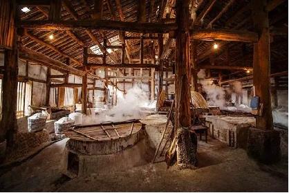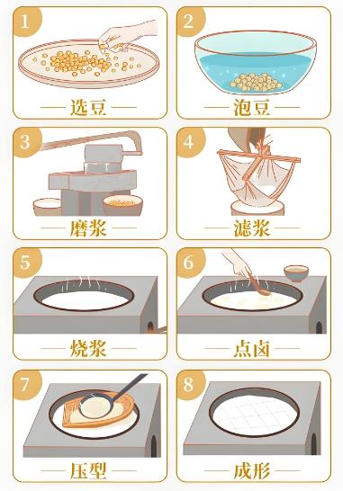 【过渡】在前面我们了解了四川省自贡井盐的煮盐工艺,说起自贡井盐人们就不免谈起富顺豆花,有盐更有味。 【情境导入】三国时期,豆腐的制作技术在四川传播,在江阳县的金川驿地区流行。 这是一个重要的产盐区,其中富顺盐井生产的盐最多。 它还位于亚热带地区,土壤肥沃,雨量充足,光照条件好,适合种植大豆。 唐朝时,自贡地区盐业的发展导致盐业工人、商人和居民人数的增加,以及水陆交通的便利,使得人们对豆瓣食品的需求量大幅上涨。 有这样的传言,一些盐业工人急着去上班,无法等待鲜嫩的豆腐形成一定规整的形状,便跑到厨房,要求老板把鲜嫩未成形的豆腐卖给他们。 由于豆腐过于鲜嫩不适合煎炒,因此他们便借助盐和水蘸着吃。 这道菜很是鲜美,由此成为一道受众很广的菜肴。 【老师引导】那如何由豆浆得到鲜嫩的豆花呢?接下来就和老师一起来看一下下面这幅豆花制作流程图。