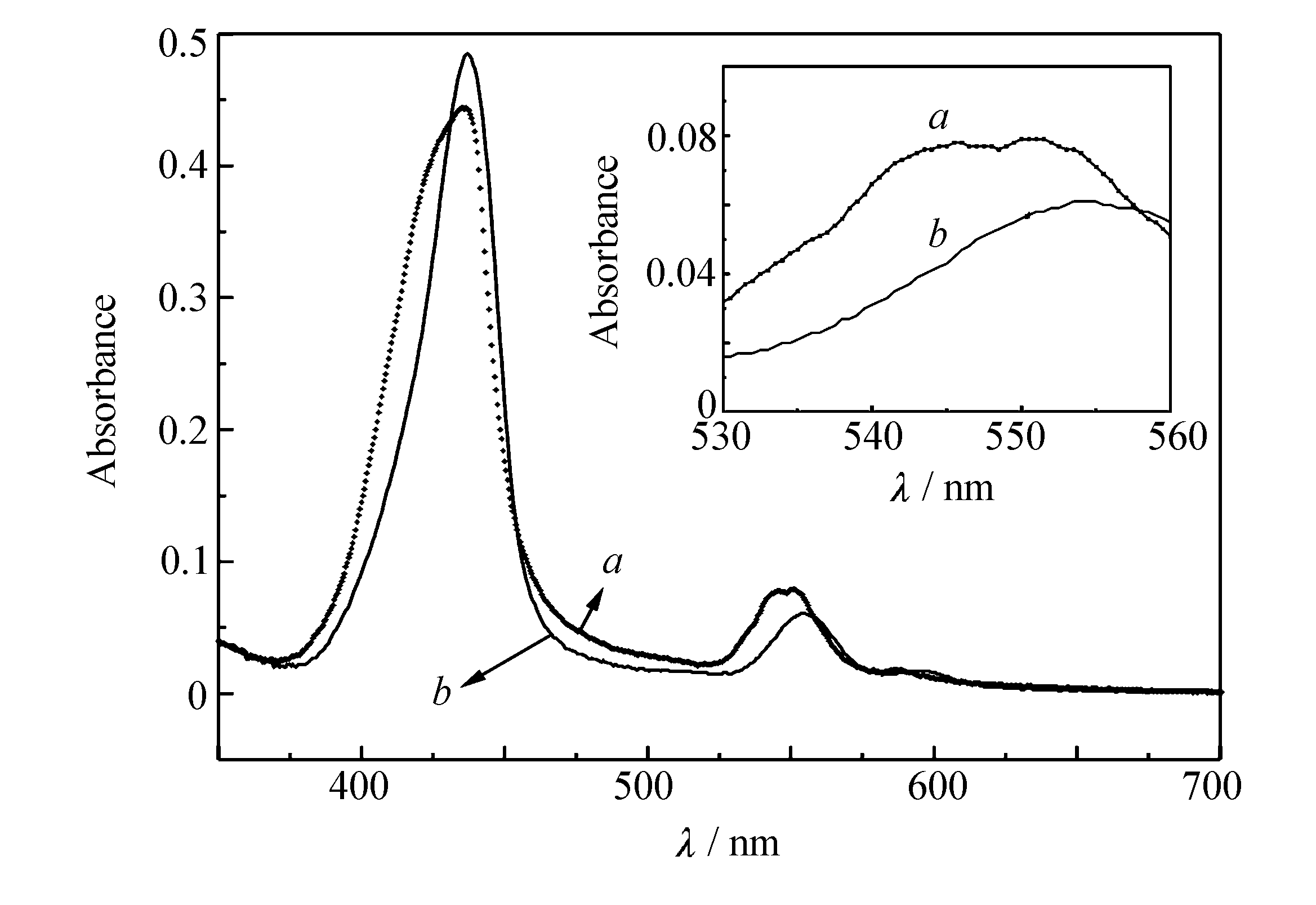 | 图5 ZnTPP薄膜接触苯乙烯蒸汽前后吸光度变化图 Fig.5 Absorbance changes of the ZnTPP film before and after exposed to styrene vapor |