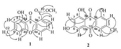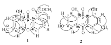 化合物1:从氢谱可以看到, δ 9.0以上为酚-OH的信号区, δ 12.15提示有1个缔合的酚羟基;有1个1,2,3-三取代的苯环[ δ 7.28(dd, J=7.3,1.0 Hz,1H,),7.52(dd, J=8.5,1.0 Hz,1H),7.74(dd, J=8.5,7.3 Hz,1H)],一个甲氧基[ δ 4.03(s,3H)],以及一个甲基[ δ 2.43(s,3H)]。 结合碳谱, δ 180.5为一个氢键缔合羰基的信号, δ 155.9、155.7为典型的连氧芳碳的位移值,猜测该化合物具有酮的母核结构[4]。 经二维谱图分析以及已报道数据比对[5],确定该化合物的结构为Janthinone。 单晶X射线衍射分析进一步确证该化合物的结构。