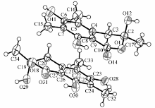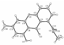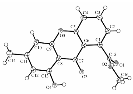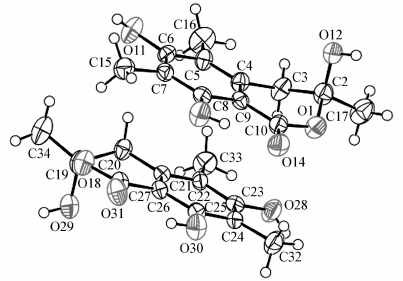 化合物1的晶体结构如图2所示。 晶体空间群为I2/a,晶胞参数 a=1.32775(4) nm, b=1.04031(2) nm, c=1.96513(5) nm, α=90°, β=104.907(3)°, γ=90°;分子式为C16H12O5,相对分子质量 Mr=284.26,晶胞体积 V=2.62259(12) nm3,晶胞内分子数 Z=8, Dx =1.400 g/cm3, μ=0.905 mm-1, F(000)=1184, R=0.0406, wR2=0.1102(2345)。