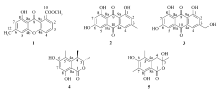 传统药用植物和特殊生境中的植物的内生真菌是重要的生物资源[10]。 本文选择海南红树植物尖瓣海莲叶内生真菌青霉菌 Penicillium sp. B21作为目标菌株,从其发酵液乙酸乙酯萃取相中分离得到8-羟基-6甲基-1-甲氧羰基酮(1)、大黄素(2)、 ω-羟基大黄素(3)、(3 R,4 S)-6,8-二羟基-3,4,5-三甲基-3,4-二氢异香豆素(4)和3,6,8-三羟基-3,5,7-三甲基-3,4-二氢异香豆素(5)。 所有化合物均为首次从尖瓣海莲叶内生真菌得到,并首次获得sclerotinin B单晶结构。 其中大黄素是一种蒽醌类化合物,具有免疫调节、抗菌、抗炎和抗肿瘤等多方面的药理作用,目前主要是从蓼科植物虎杖中提取。 通过生物发酵的办法,可高效廉价的得到大黄素单体,具有广阔的应用前景,值得进一步研究。
