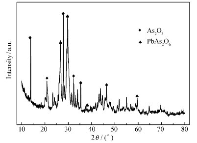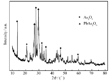对白烟灰进行XRD测试,其结果见图1。 由图1可见,13.8°、22.6°和27.8°的衍射峰为As2O3的特征衍射峰,而26.6°、30.1°、60.4°为PbAs2O6的特征衍射峰。 表明样品中砷主要以As2O3和PbAs2O6等化合物形式存在。 由于Cu、Zn等金属元素在样品中含量较低,故XRD谱图中这些金属元素化合物衍射峰并不明显。