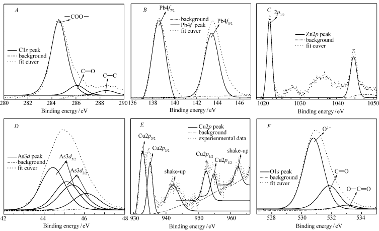 对白烟灰组成各元素进行XPS精细扫描和分峰拟合分析,结果如图3所示。图3 A为C1 s峰,位于284.6、286.1 eV的峰为C—C、C=O键[24],是标准的C峰,这2个峰的出现可能是样品在测试时与空气接触受到污染所致[17]。 结合能为288.5 eV的峰为O—C=O键[25]。图3 B为Pb4 f峰,分别位于138.6和143.6 eV的两个对称的峰为Pb4 f的Pb4 f7/2和Pb4 f5/2,是Pb(Ⅱ) 的特征峰[26]。 在138.6 eV的Pb4 f7/2峰为PbO[18],结合XRD分析结果,我们认为在143.6 eV的Pb4 f5/2峰为以PbAs2O6化合物形式存在的Pb(Ⅱ)。图3 C为Zn2 p的峰,位于1021.7 eV处是Zn2 p3/2的光电子峰,对应的物质为ZnO[19]。图3 D为As3 d峰,该峰有3 d5/2和 d3/2双重峰 (结合能差(0.7±0.1) eV)[27],位于44.4 eV(As3 d5/2)和45.0 eV(As3 d3/2)处为三价砷氧化物(As2O3)的峰[20],一般来说,三价砷结合能低于五价砷1 eV, 位于45.2 eV(As3 d5/2)和46.0 eV(As3 d3/2)处为五价砷化合物的峰[21],结合XRD分析结果可知,五价砷的化合物可能为PbAs2O6。图3 E为Cu2 p峰,在932.8和952.7 eV有Cu2 p3/2和Cu2 p1/2两个峰,两个主峰成对出现[28],其中,位于932.8 eV处Cu2 p3/2峰对应的是Cu(Ⅰ)[22],NIST数据库中显示为Cu2S;位于935.0 eV处 Cu2 p3/2及在942.4 eV出现的振起(shake-up)伴峰证明存在Cu(Ⅱ)[23],结合图3 A C1 s峰分析结果可知该物质为CuC