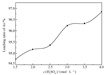 在液固比7:1,45 ℃,4 h,9%双氧水下研究了H2SO4浓度对砷浸出率的影响,如图5所示。 由图5可见,砷的浸出率随溶液中H2SO4浓度的增大而增大,当H2SO4浓度为4 mol/L,砷浸出率达96.8%,如果继续增加H2SO4浓度,对反应装置要求高,溶液酸度过大,后期处理困难,因此H2SO4浓度定为4 mol/L。