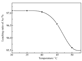在酸浸过程中,温度是主要因素,选择适宜的浸出温度,可以得到理想的浸出效果,也影响到工艺放大的难易程度。 本研究选择在30~50 ℃范围内,在液固比为7:1,H2SO4浓度为4 mol/L,浸出时间为4 h,9%双氧水的条件下,考察温度对砷浸出率的影响,实验结果如图6所示。 由图6可见:当温度为30 ℃时,砷的浸出率高达97.1%,随后浸出率随着温度的升高反而下降,其原因是温度过高,加快H2O2在溶液中的分解速率,降低了浸出率,且升温会增加能耗。 因此,选择浸出温度为30 ℃比较合适。