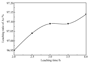 30 ℃,液固比7:1,9%双氧水,H2SO4浓度为4 mol/L的条件下,研究时间对砷浸出率的影响。 如图7所示,砷的浸出率随反应时间延长而升高,当反应时间为3 h,砷的浸出率达97.1%,延长反应时间,对砷的浸出率影响不大,因此,控制反应时间为3 h较为合适。