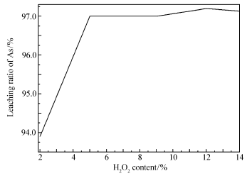 根据以上分析结果,可知白烟灰含有As(Ⅲ)和As(Ⅴ),为达到脱砷目的,通常采用碱浸,但是碱浸一般要求温度高,且浸出率不理想,而以酸作浸出剂,将固态砷解离为可溶于水的砷酸根或亚砷酸根离子,因为As(Ⅲ)毒性及不稳定性远大于As(Ⅴ),而此样品中三价砷含量又较高(11%),因此添加H2O2使As(Ⅲ)转化为As(Ⅴ),将其从高毒性的冶金废液变为低毒性的废液,为进一步除砷做准备。