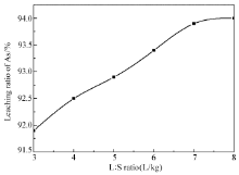 首先,在45 ℃,时间为4 h,H2SO4浓度2 mol/L,9%双氧水下探索了液固比对砷浸出率的影响,如图4所示。 由图4可见,砷的浸出率随着液固比的增加而增大,当液固比为7:1时,砷的浸出率达到94.0%,继续增大液固比,浸出率趋于平缓,因此选择液固比为7:1较合理。