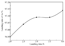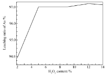 H2SO4中加入H2O2作为强氧化剂,使亚砷酸根转化为砷酸根离子。 而H2O2浓度的大小,对浸出率有直接的影响。 本实验在30 ℃,液固比7:1,H2SO4浓度为4 mol/L,时间 3 h,探索了H2O2含量对砷浸出率的影响,如图8所示。 由图8可见,当H2O2含量为5%时,浸出率达到97.1%,随着用量的增加,浸出率有一定的增长,但效果不明显,因此,选择5%的H2O2较合适。